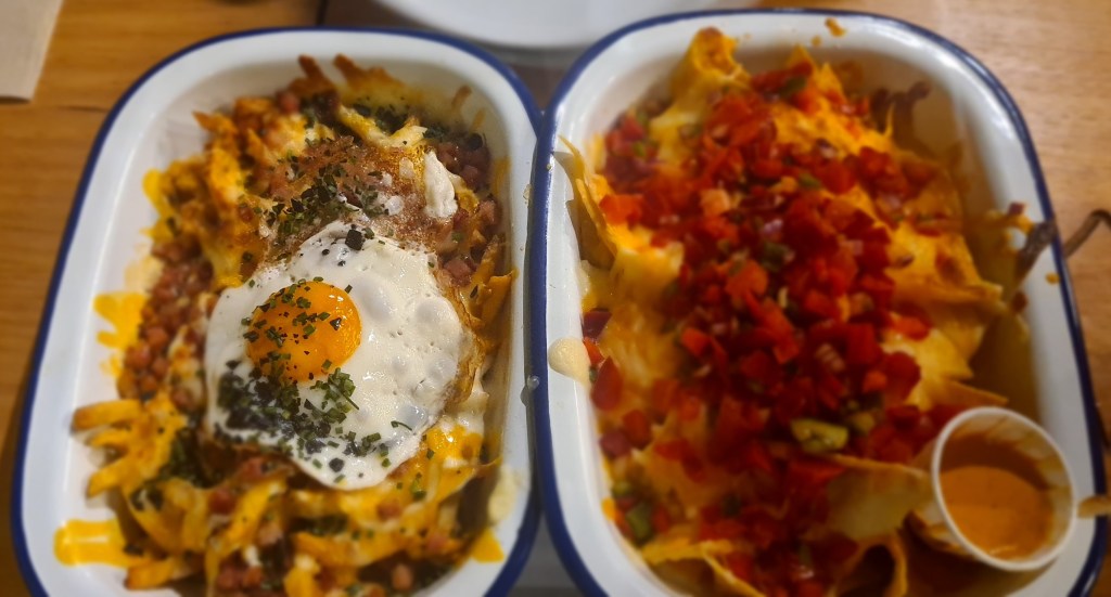 Comic Planet Fries: Patatas naturales recién fritas con sal negra. Salsa cheese & cream y crujientes daditos de bacon. Yema de huevo.