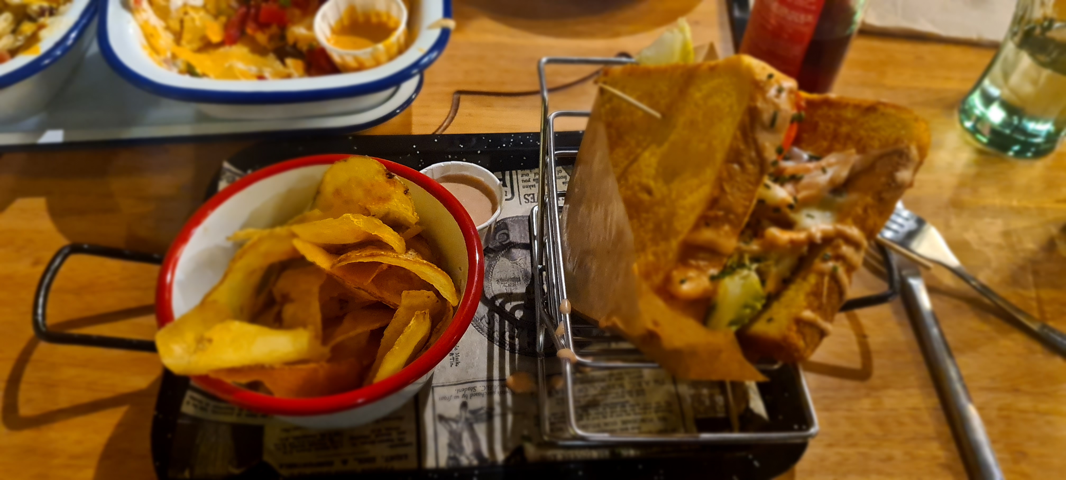 Sándwich Comic: Tostadas francesas con lechuga, tomate, bacon crujiente, pulled de pollo a la brasa y queso Edam.