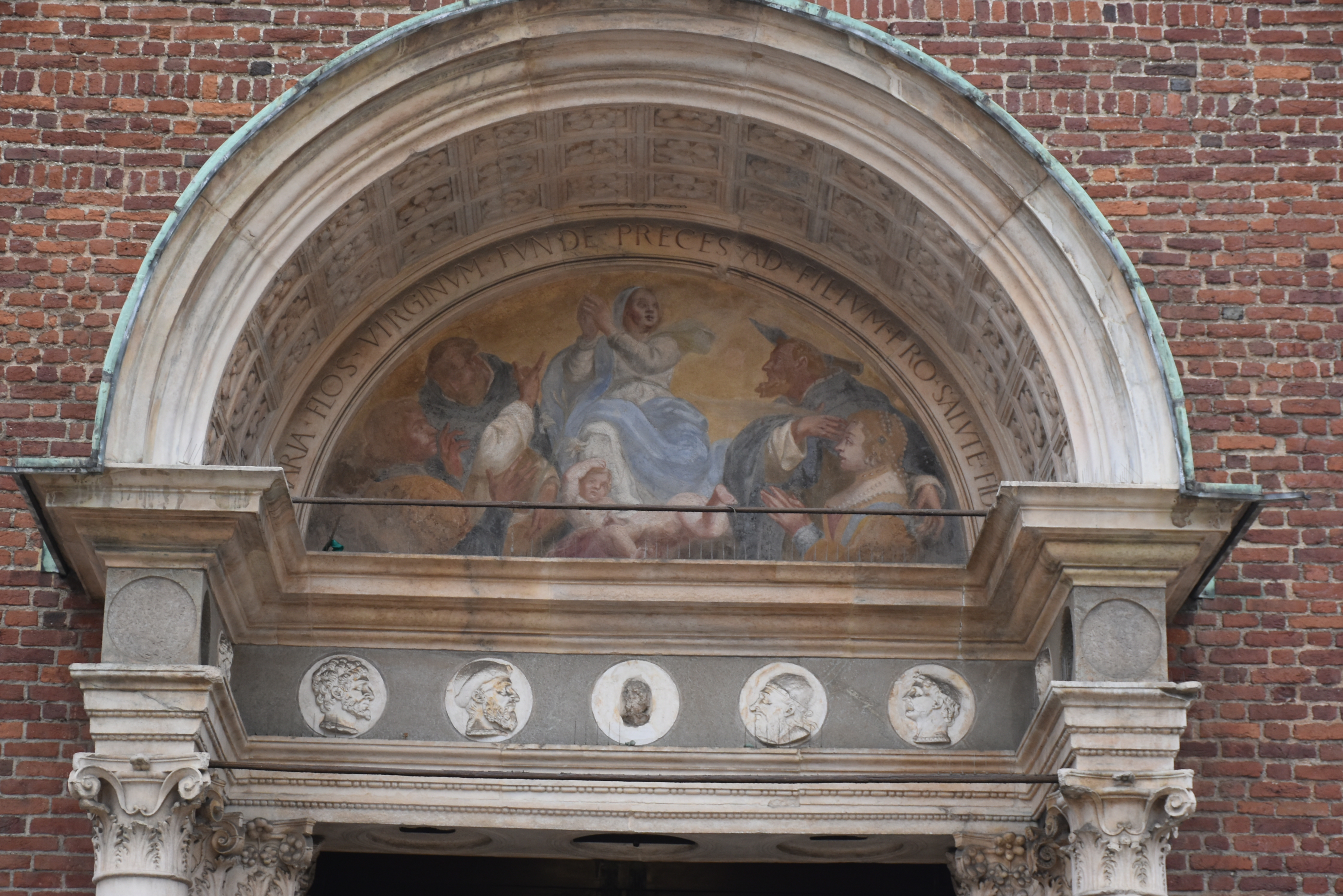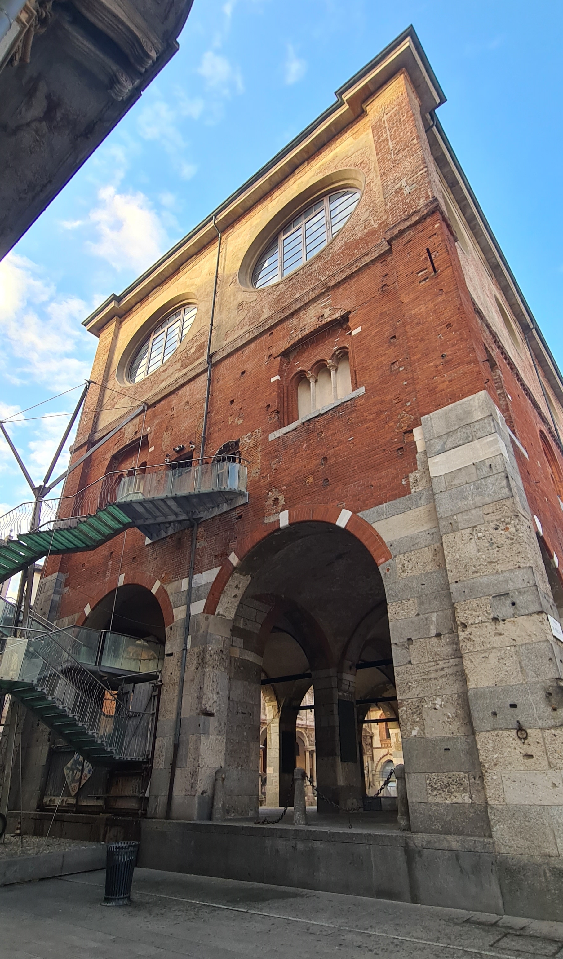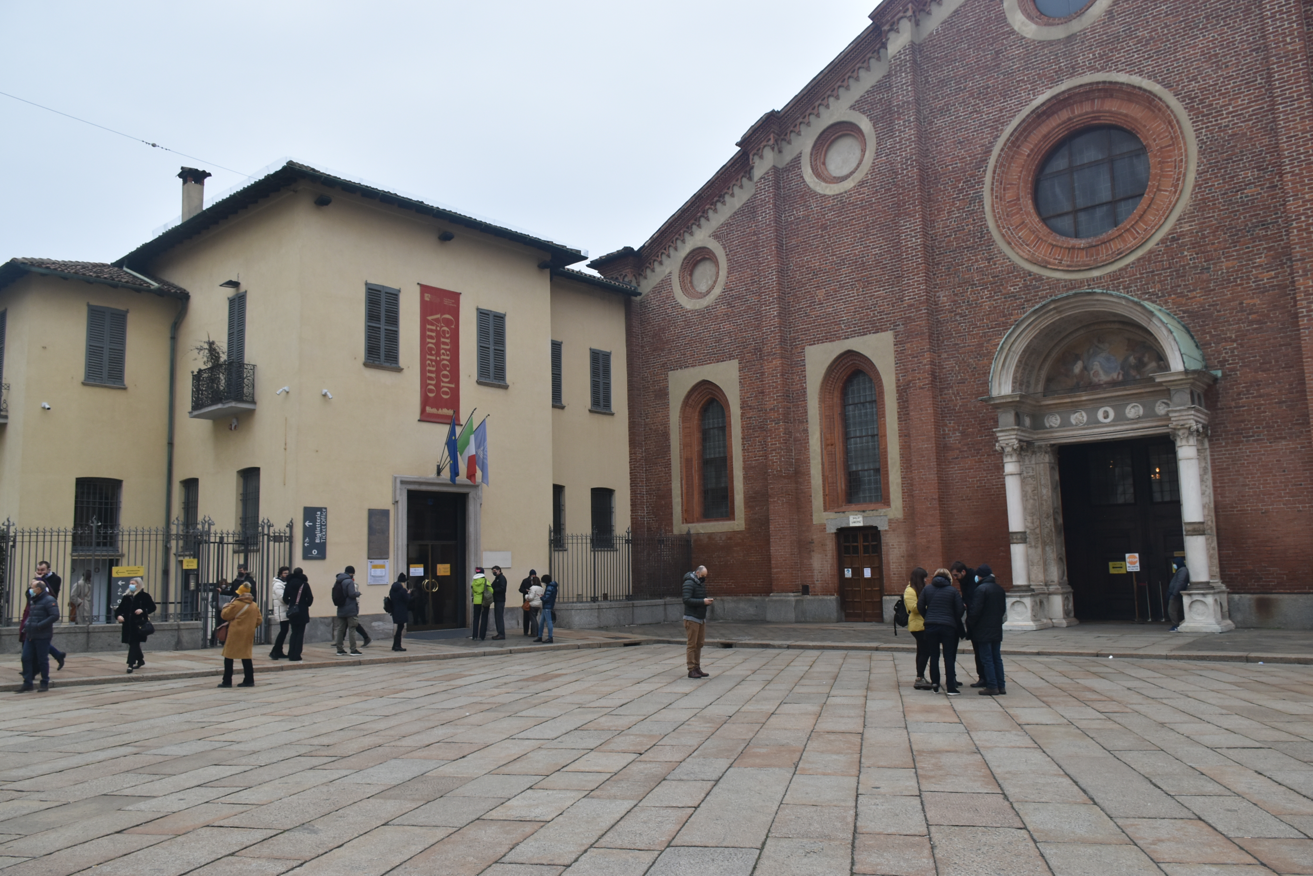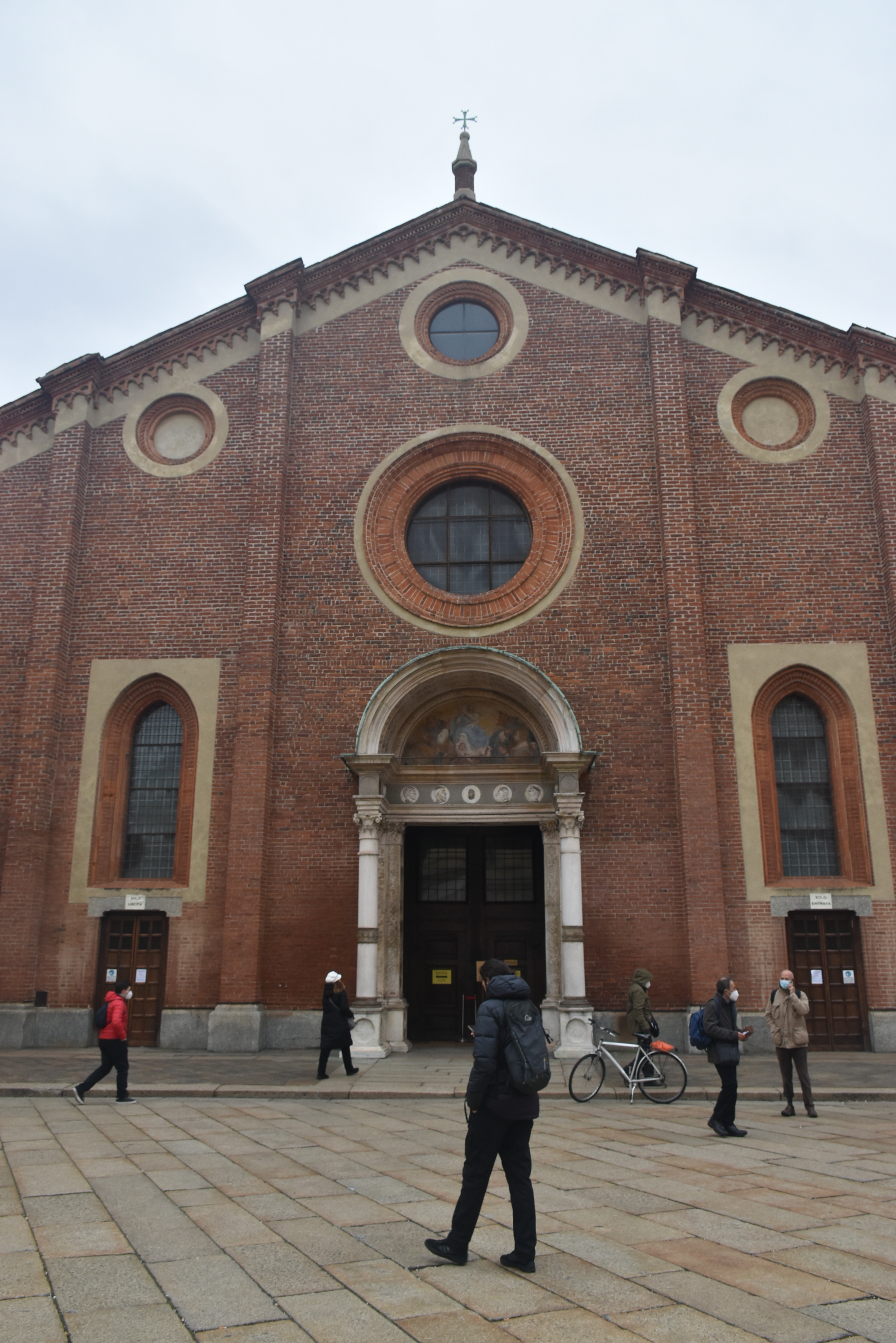 La fachada de ladrillo de Solari y la puerta diseñada por Bramante. En el luneto, la pintura de Leonardo da Vinci, un buen aperitivo…