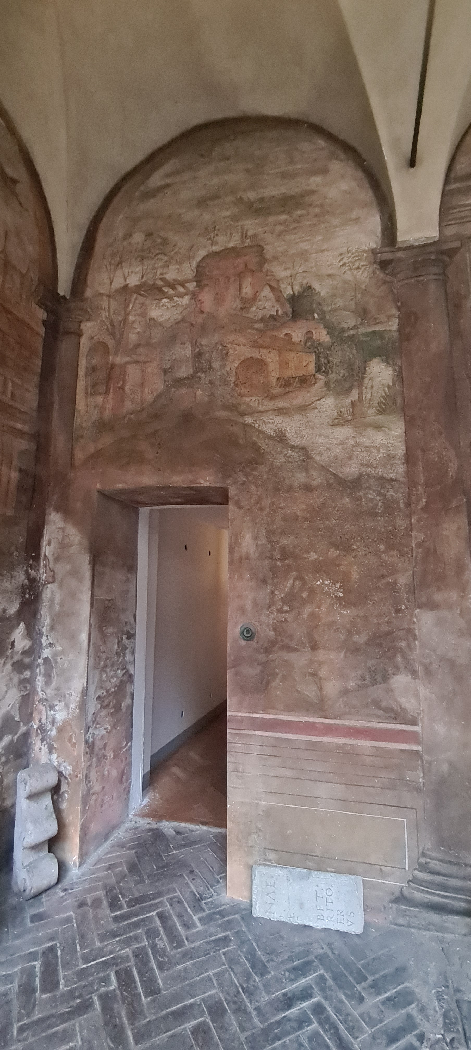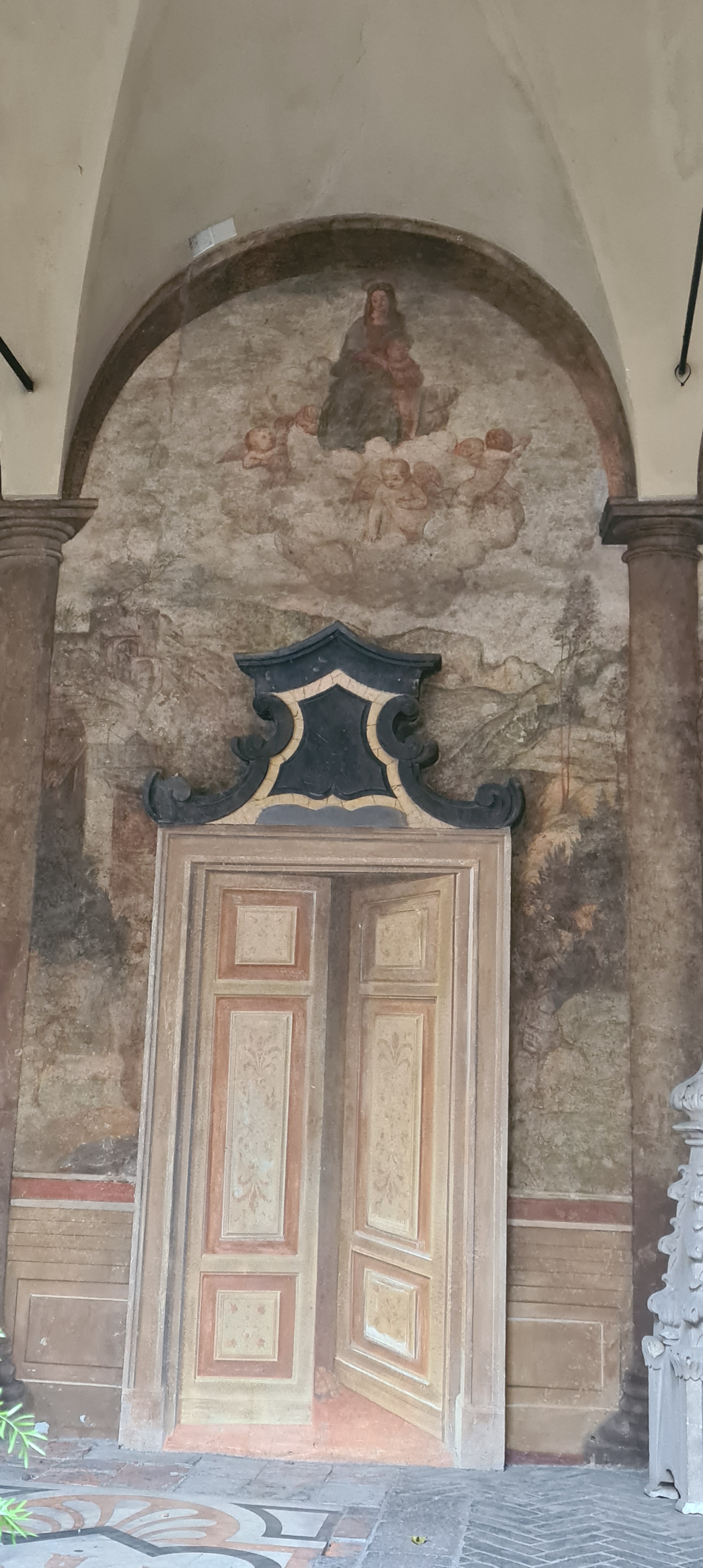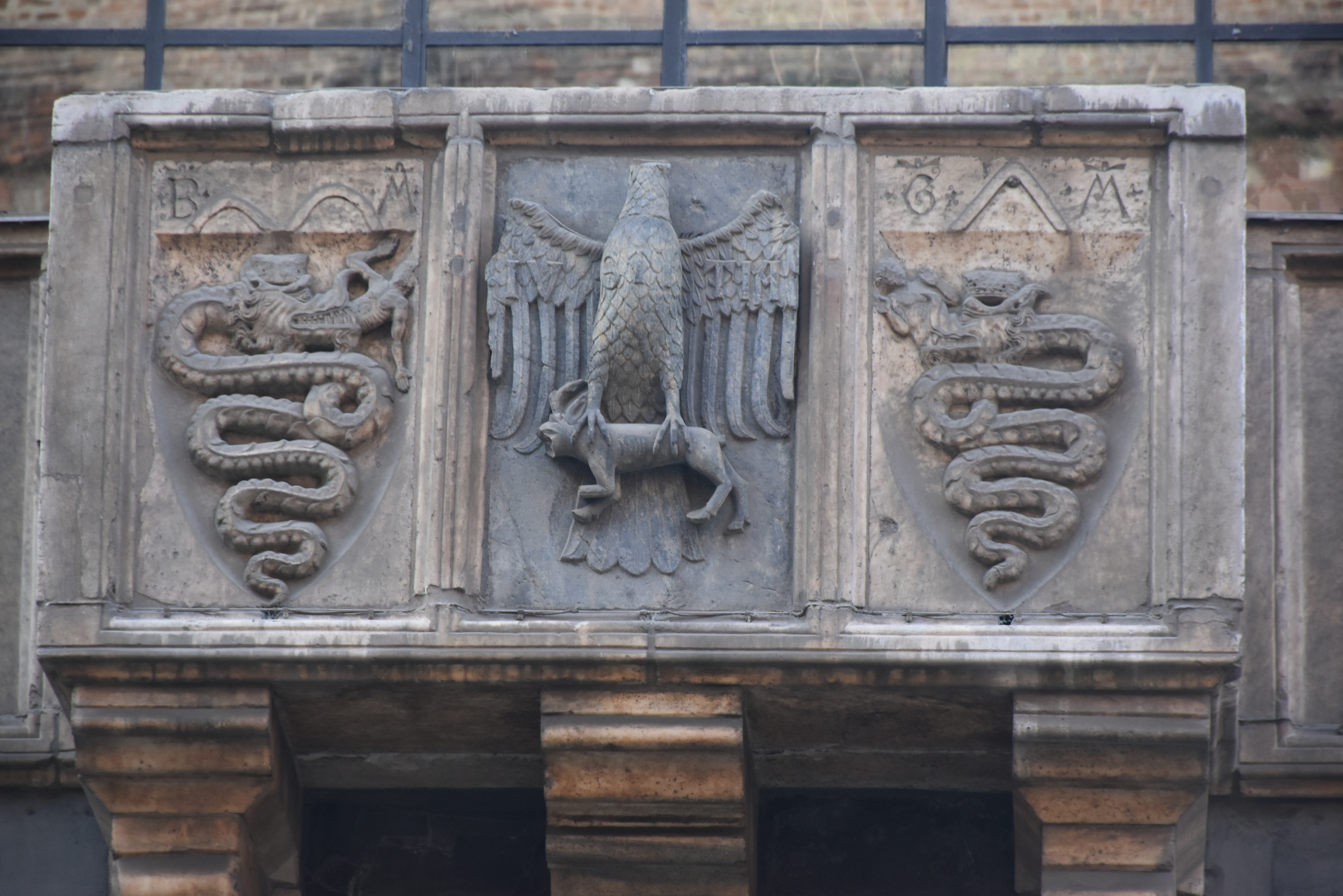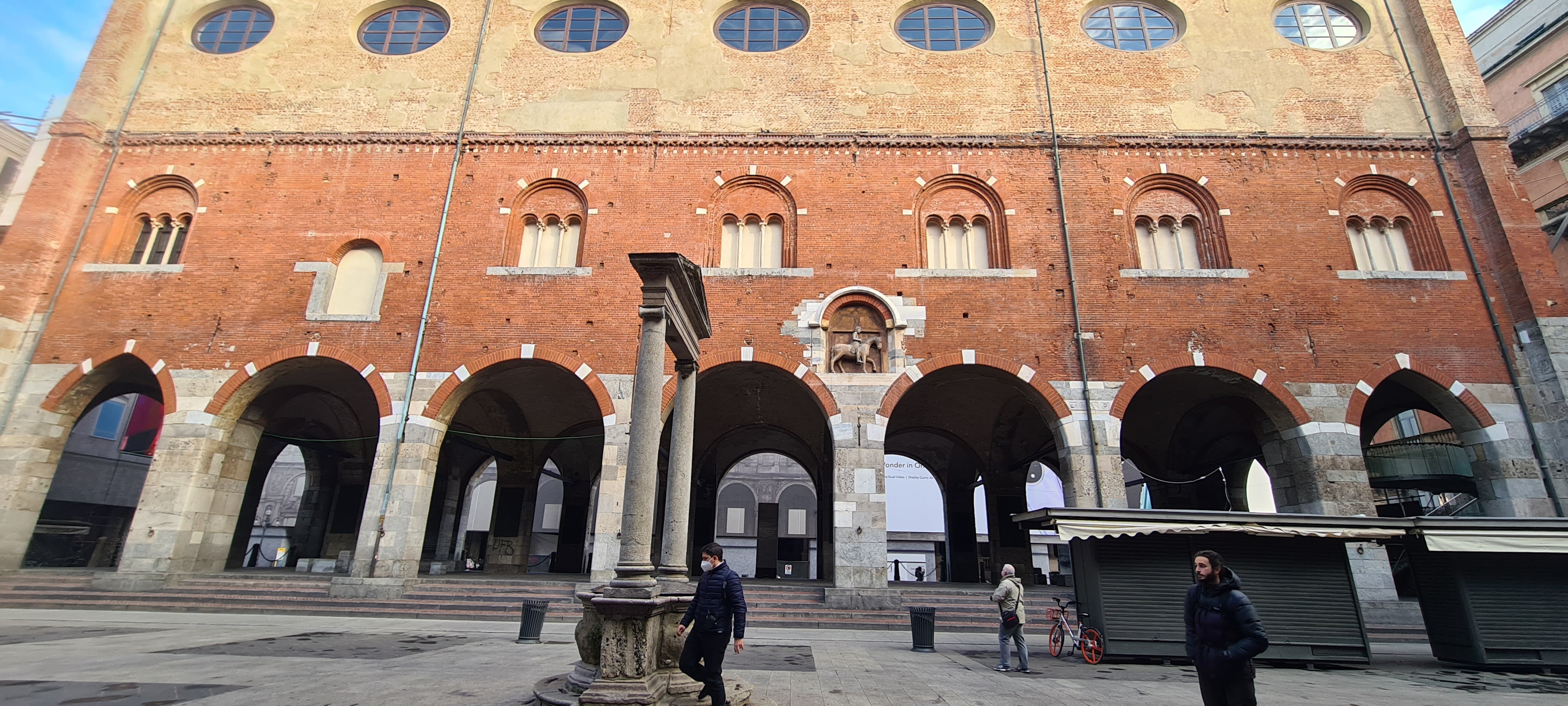 La fachada de ladrillo de Solari y la puerta diseñada por Bramante. En el luneto, la pintura de Leonardo da Vinci, un buen aperitivo…