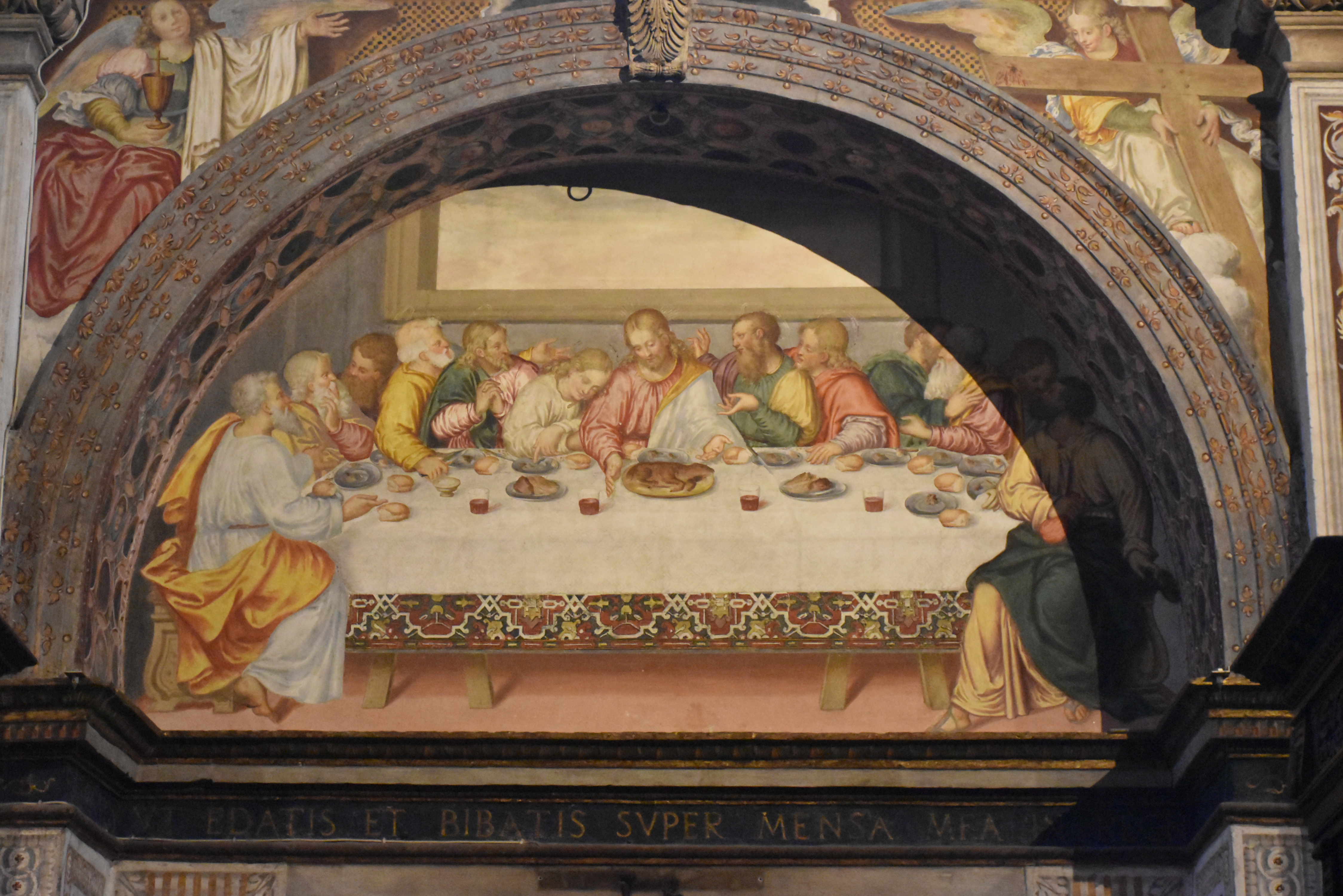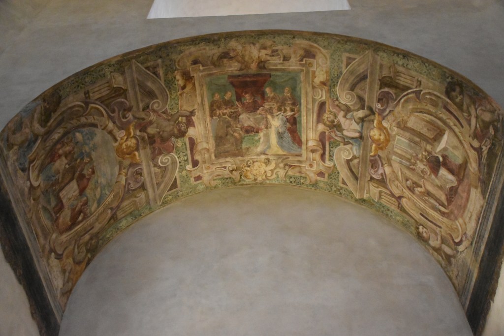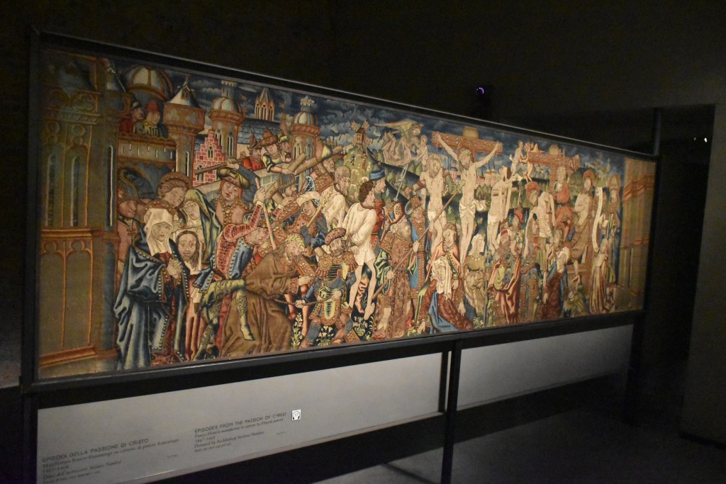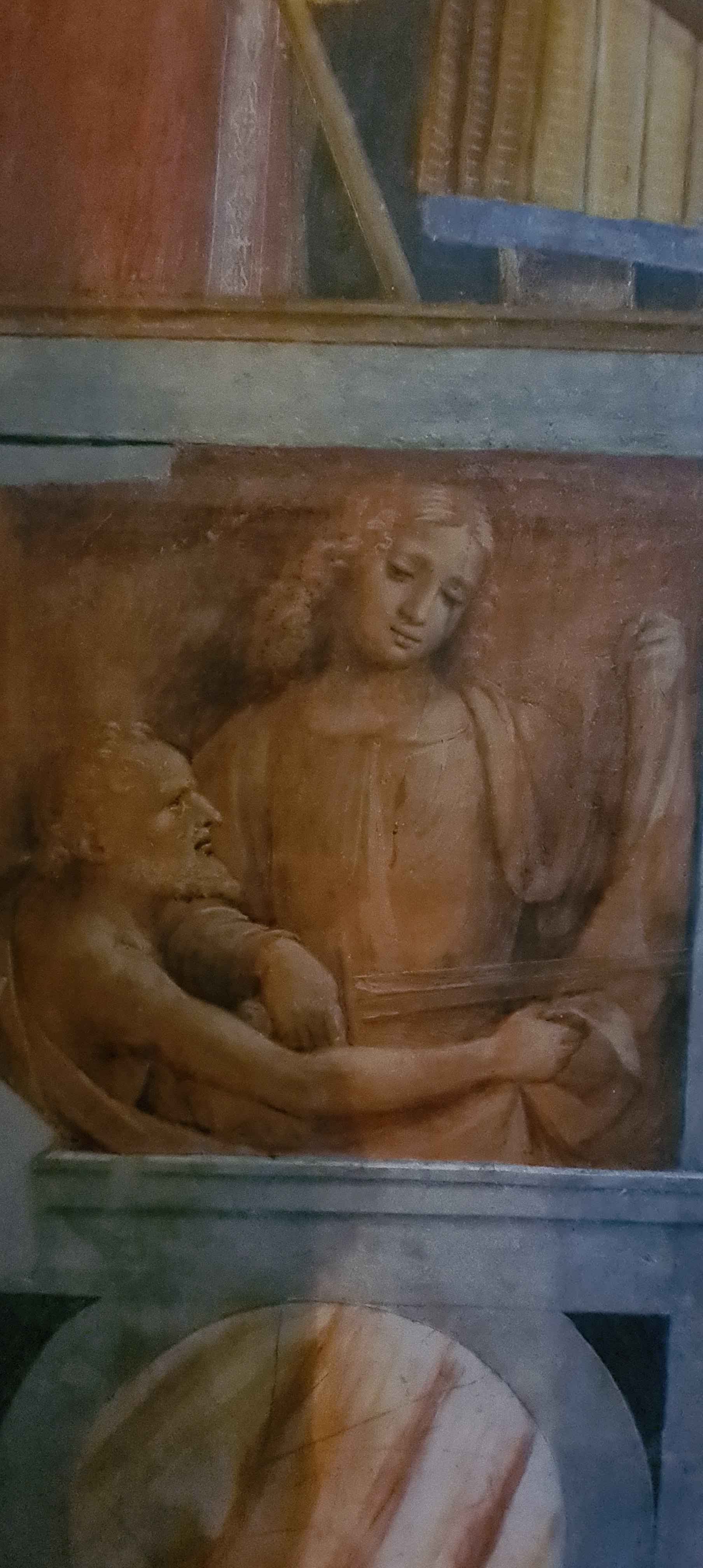 En el extremo opuesto a la Última Cena, los dominicos del monasterio encargaron a Donato Montorfano una Crucifixión. Pero está en plena restauración, así que no pudimos verlo, ni tampoco unos retratos que hizo Leonardo de Ludovico El Moro, de su mujer Betrice y de sus hijos, con su firma y año 1495.