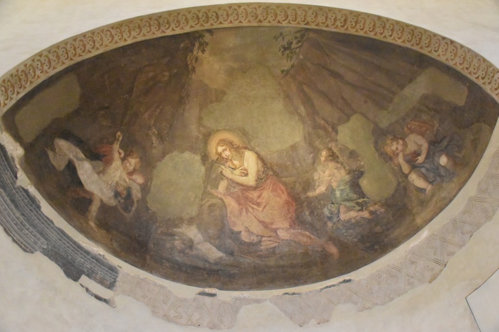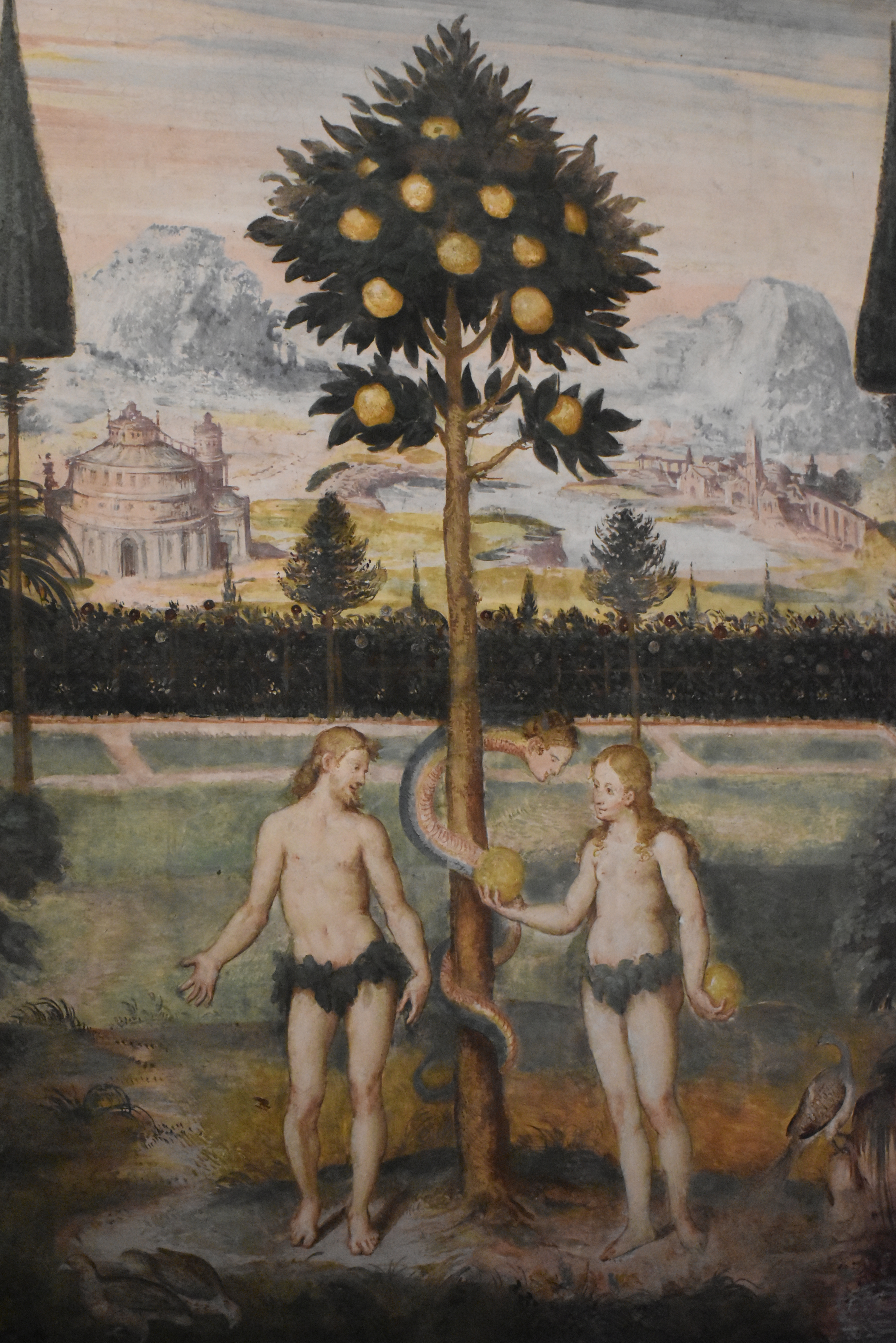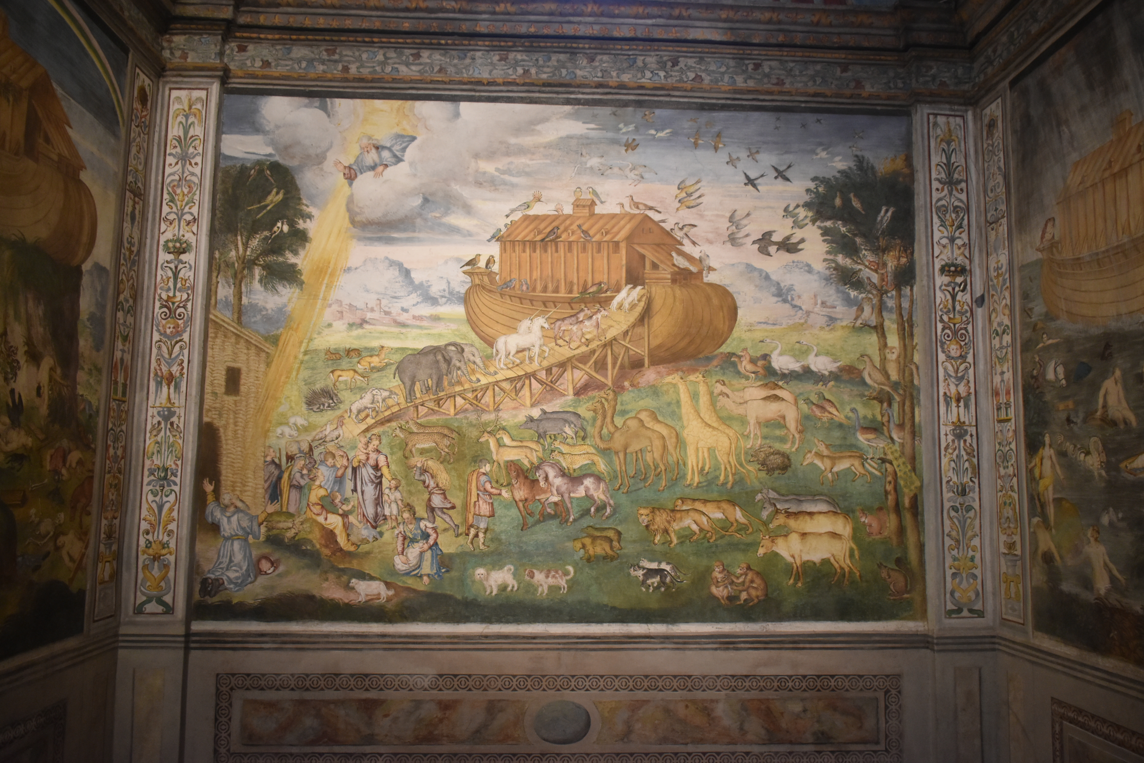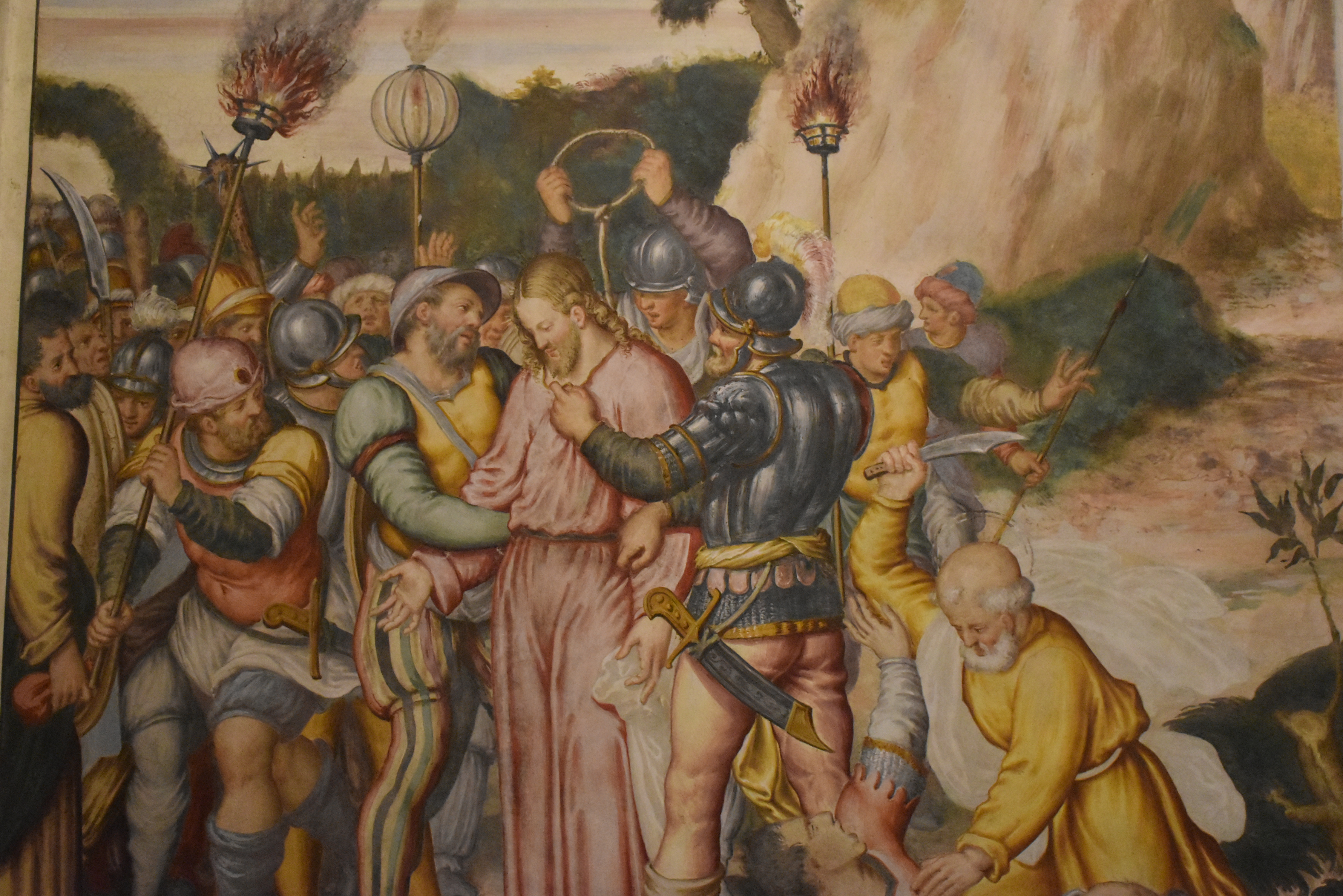 En el extremo opuesto a la Última Cena, los dominicos del monasterio encargaron a Donato Montorfano una Crucifixión. Pero está en plena restauración, así que no pudimos verlo, ni tampoco unos retratos que hizo Leonardo de Ludovico El Moro, de su mujer Betrice y de sus hijos, con su firma y año 1495.