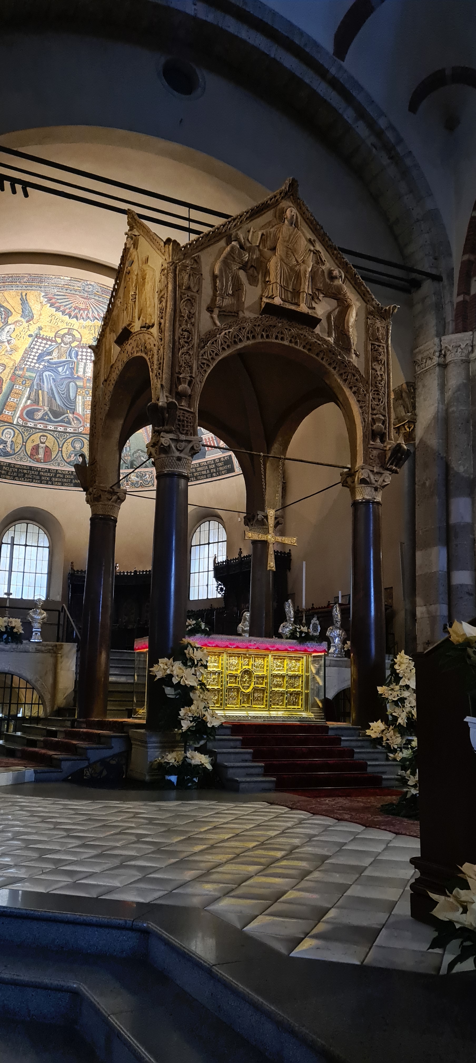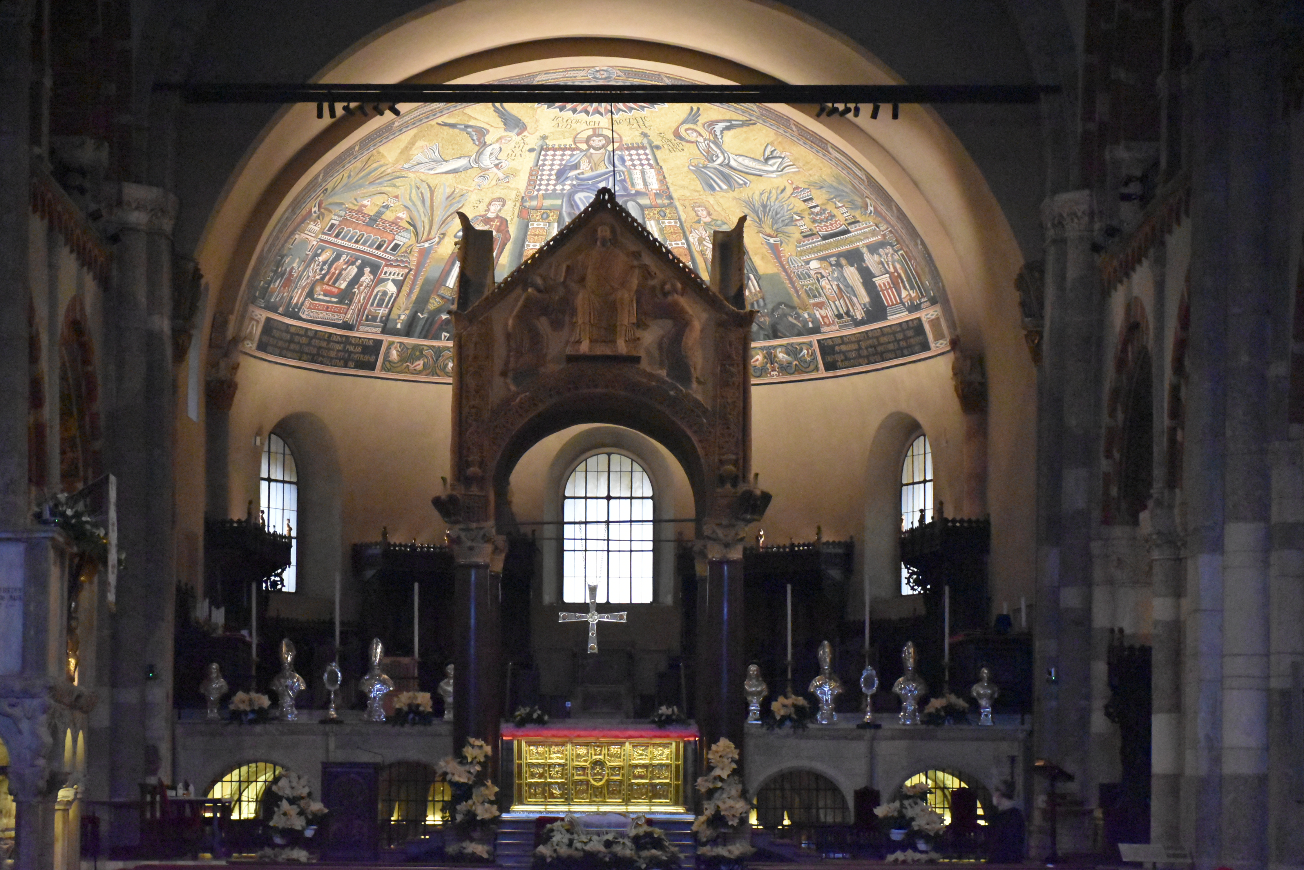 El altar dorado fue hecho en el siglo IX para guardar los restos de San Ambrosio. El mosaico del ábside es de los siglos IV al VII. Fue restaurado después de los bombardeos de la 2ª Guerra Mundial.