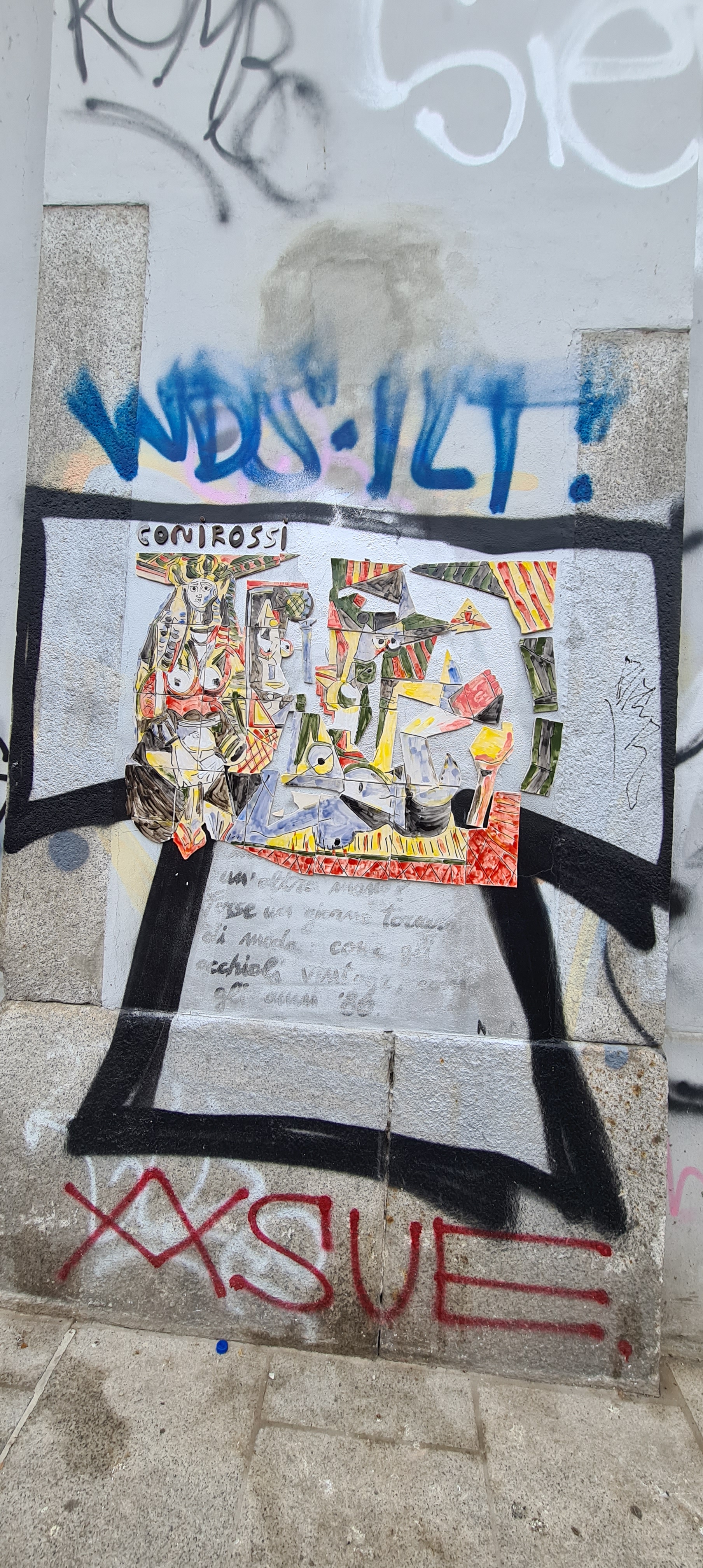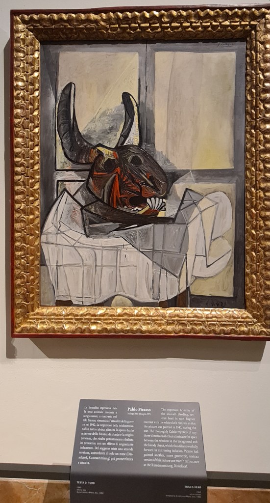 Alguna joyita hay en la pinacoteca. Cristo Yacente de Mantegna (1480), vimos unas obras de Morandi y de Modigliani «dialogando» con clásicos italianos. Una sala con frescos de Luini, muy importante en Milán. También un retrato de Sofonisba Anguissola. Un Picasso «Cabeza de toro». Piero de la Francesca, Caravaggio, Rafael…