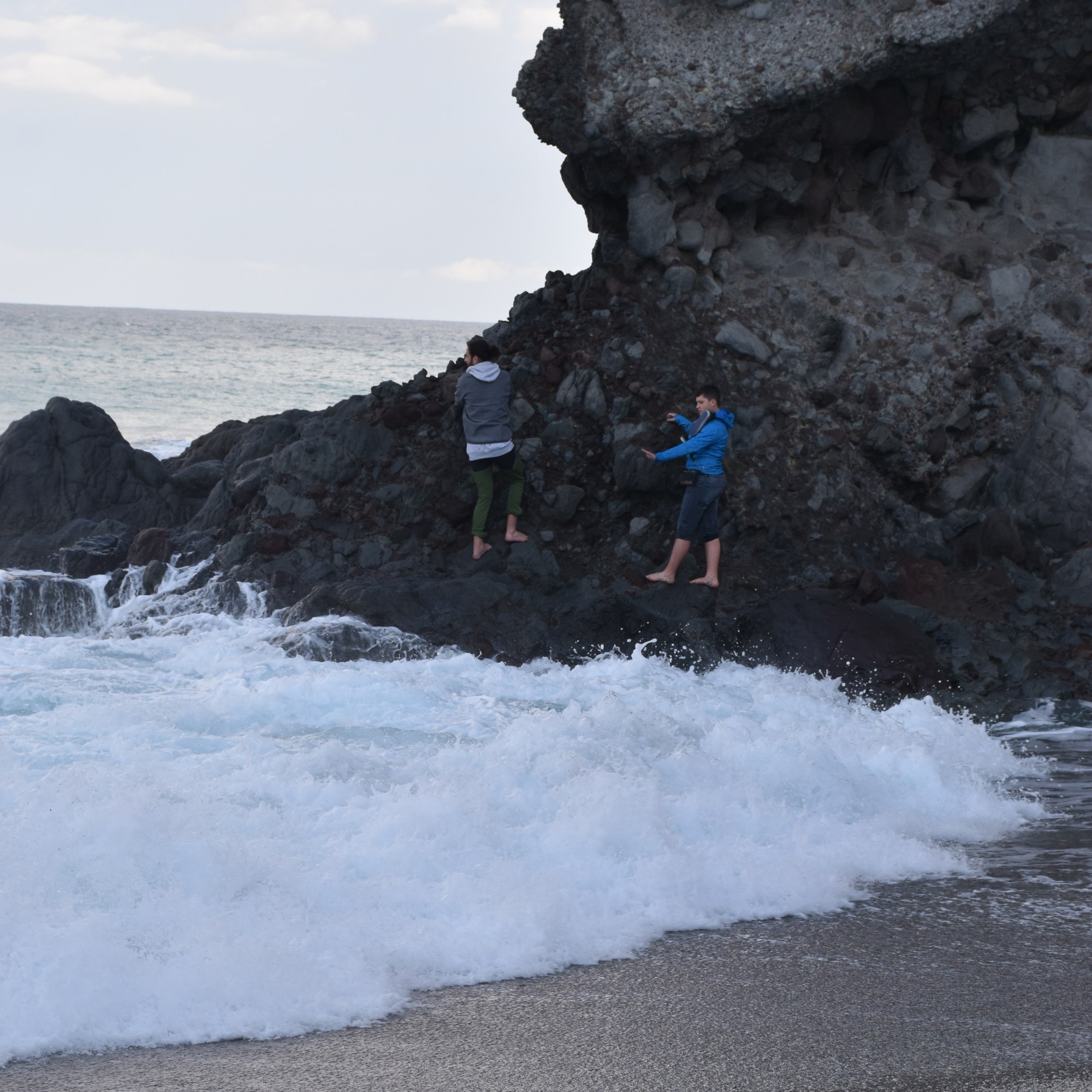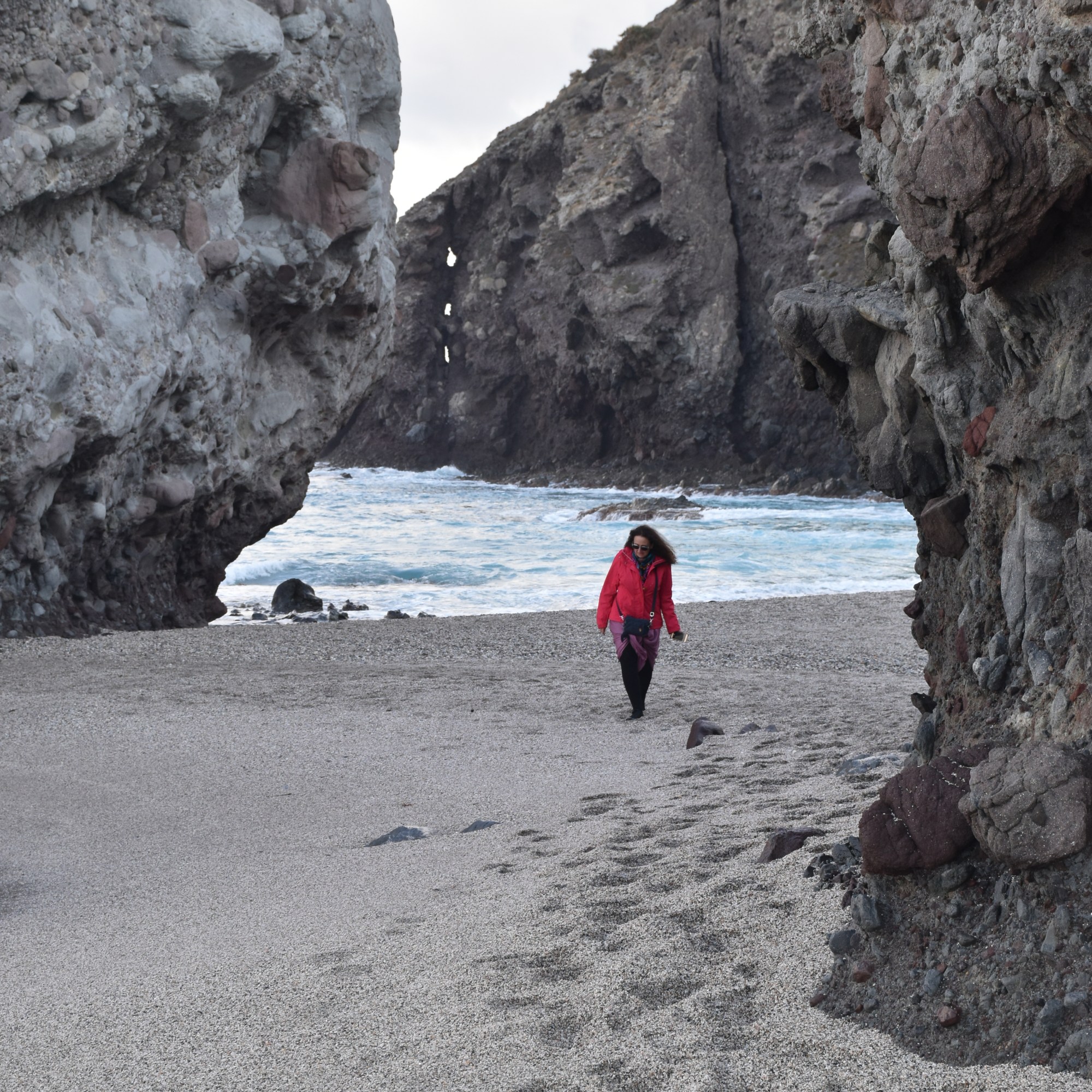 Nos vamos hacía la derecha, hasta llegar a dos grandes rocas de origen volcánico, separadas por un pequeño pasillo de arena.