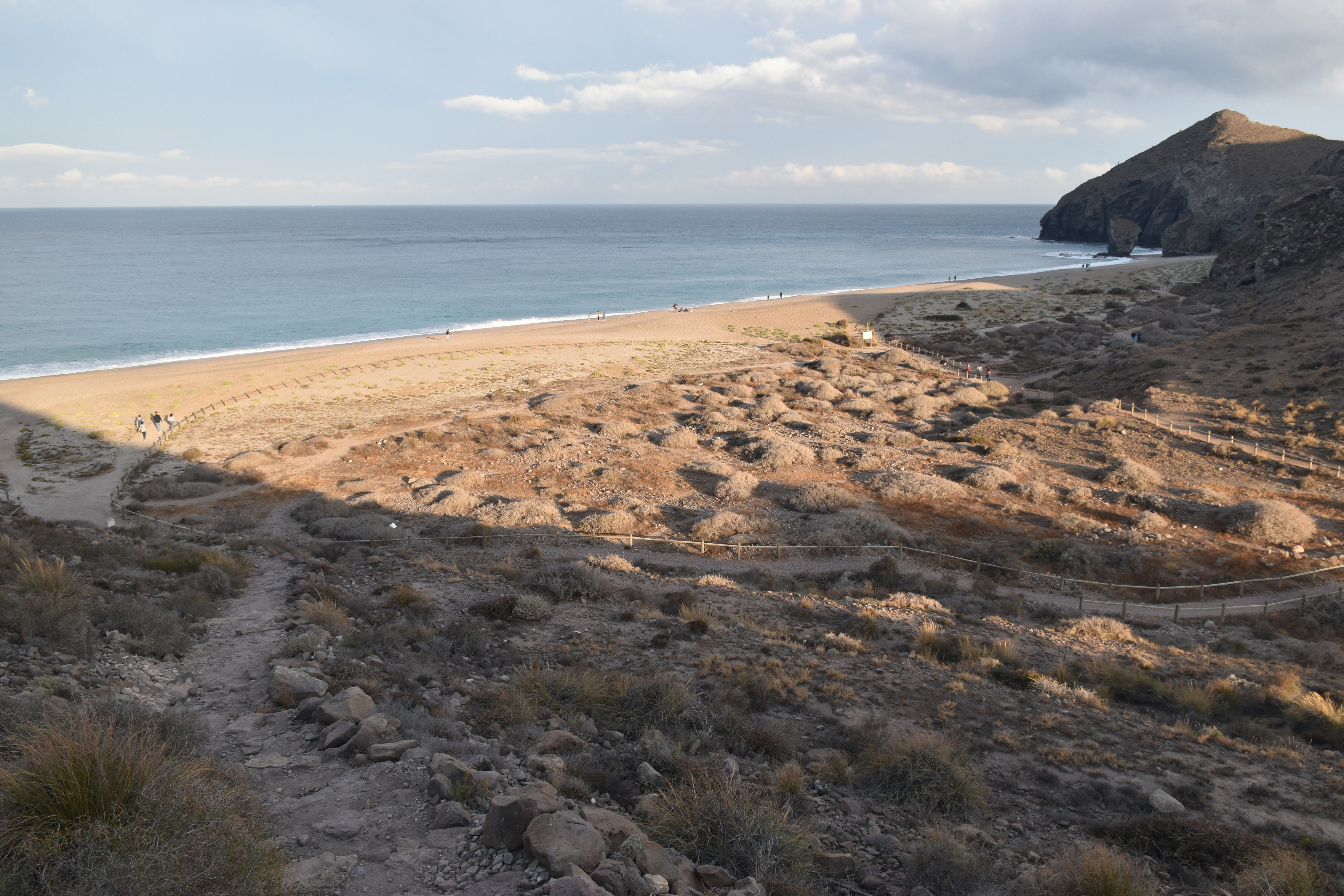 Hay que cruzar la carretera que lleva a Carboneras desde Agua Amarga y encontraremos el camino que lleva a otro aparcamiento y al Mirador de la playa y la estrecha senda que baja. Iríamos por ese camino para luego subir de la playa al Mirador y volver por ahí.
