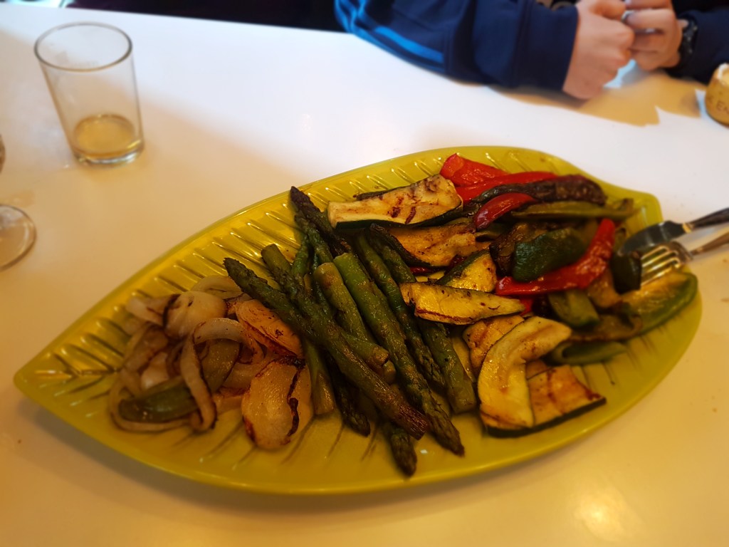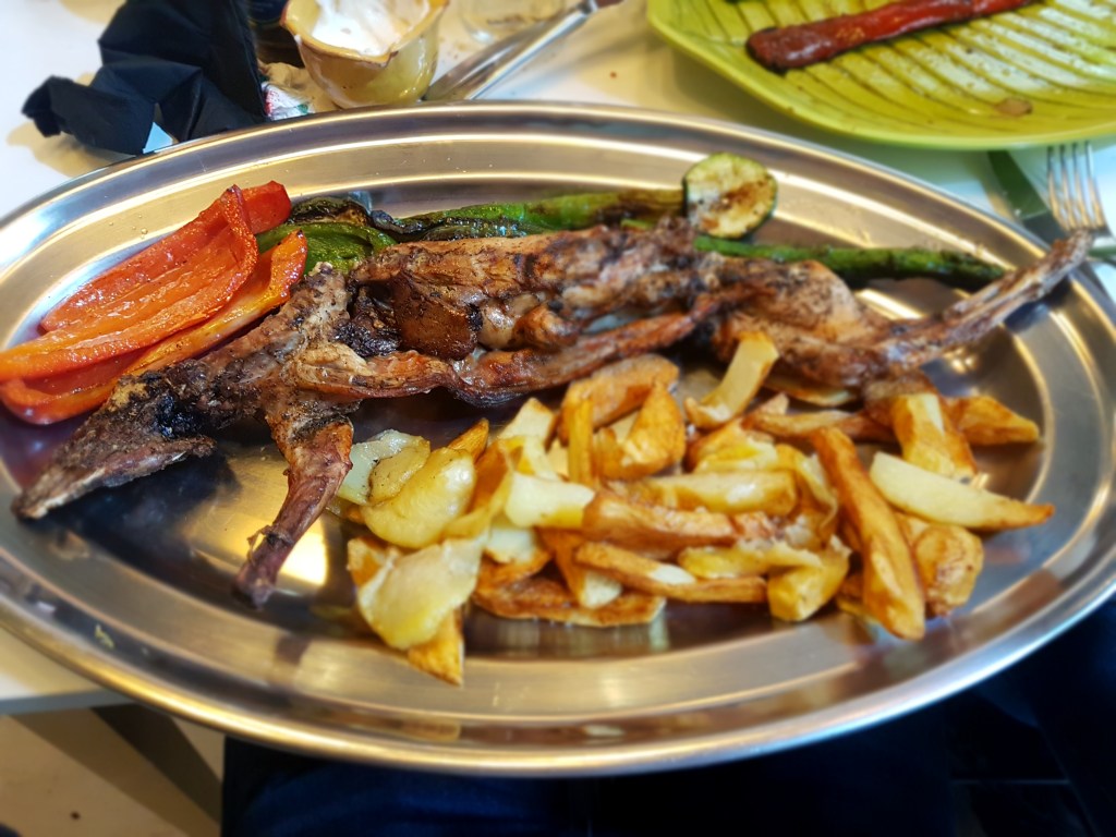 Verduras a la plancha.Patatas a lo pobre.Conejo a la brasa.