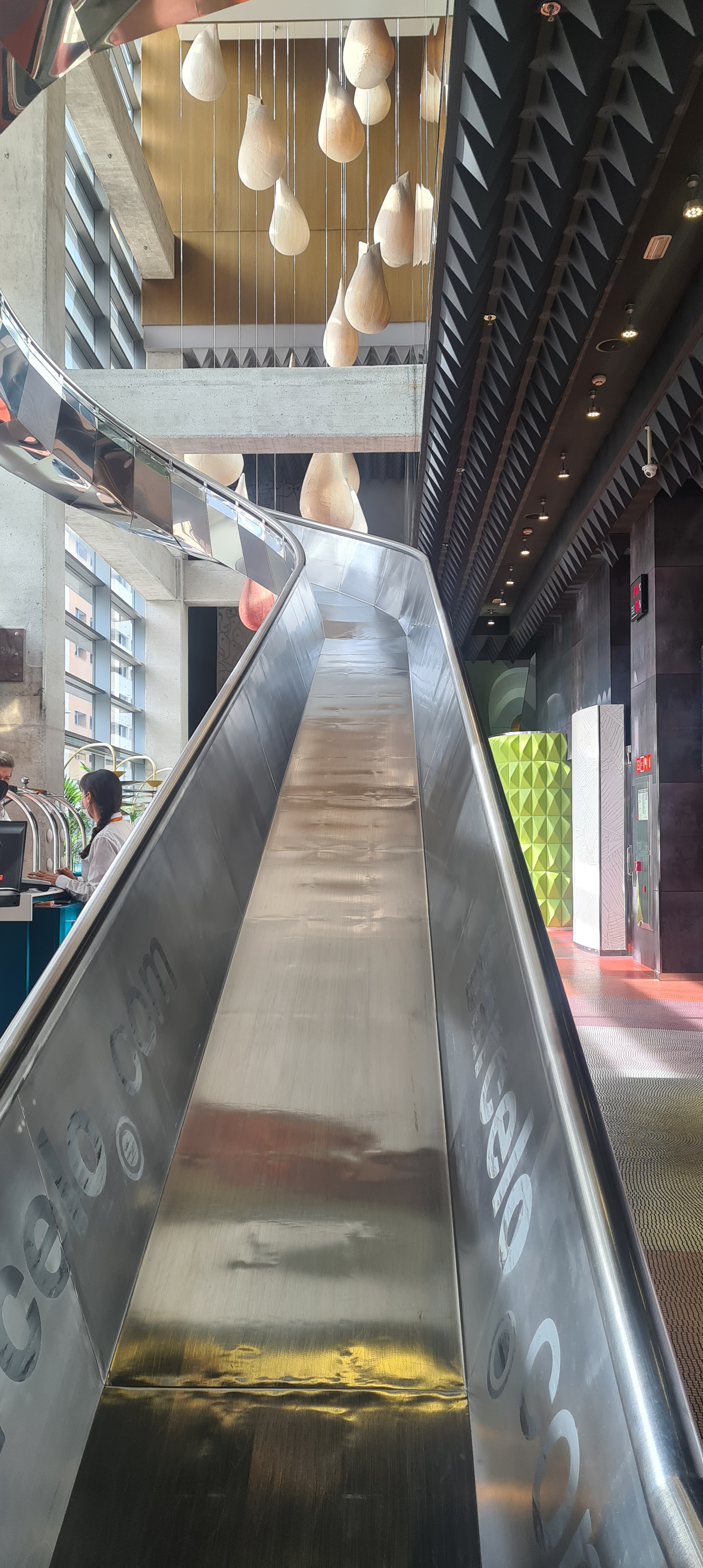 La escultura ha sido realizada por Jordi Torres para el B Lounge del hotel Barceló Málaga. El tobogán gigante lleva de la primera planta hasta la recepción…. Os aseguro que con la vergüenza no se va a ningún sitio y sin embargo me quedé con las ganas de tirarme todos los días que estuvimos. Cada vez que bajaba a desayunar decía, me lanzo….