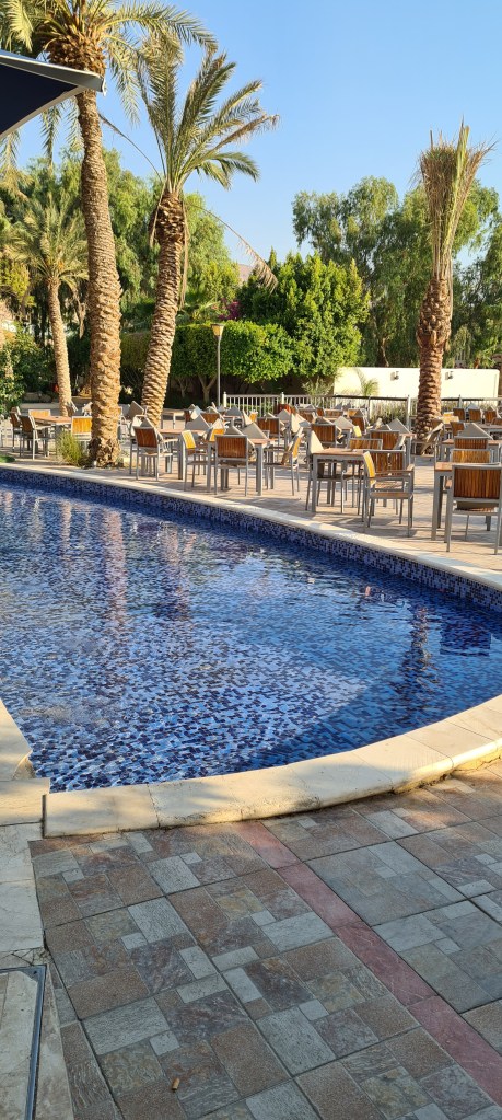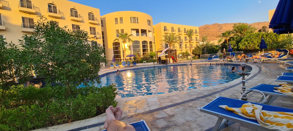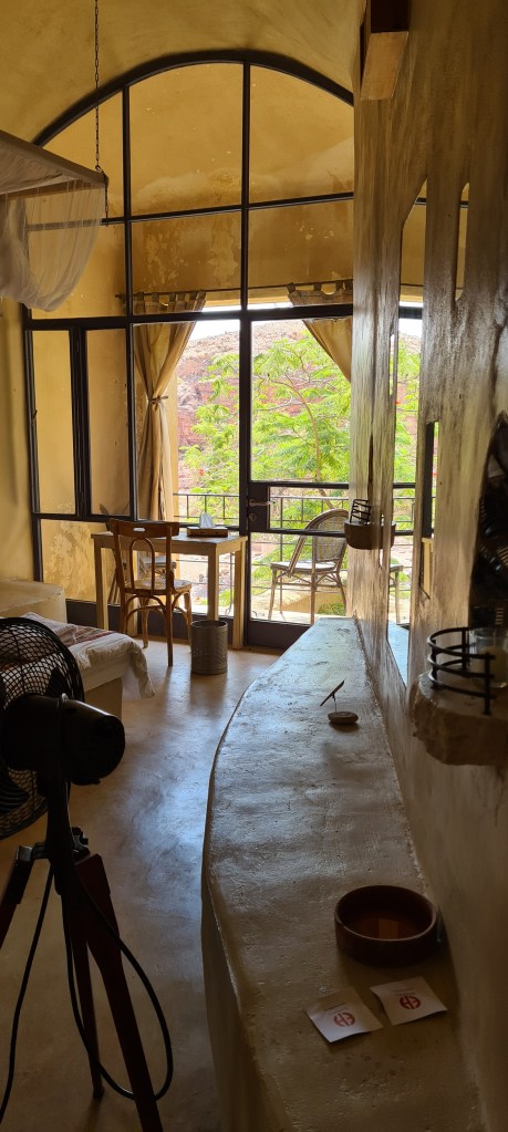 Tengo que decir que lo maravilloso de este hotel es su ubicación en un alto con vistas a la Reserva Natural. Es un lugar ideal para familias y personas que quieren hacer senderismo, muchas rutas parten de aquí para conocer la zona. Es más, no es posible adentrarse en la Reserva si no vas con guía. El camino hacia Feynan es uno de los más famosos y es el que haríamos nosotros. Tenemos la tarde y noche para descansar y prepararnos para la ruta.