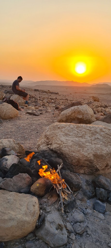 Nos apuntamos Pablo y yo a ir con uno de los beduinos del hotel a ver anochecer a unos dos km y tomarnos un té en el desierto. Momento compartido inolvidable, de esos que ya hace que merezca la pena el viaje.