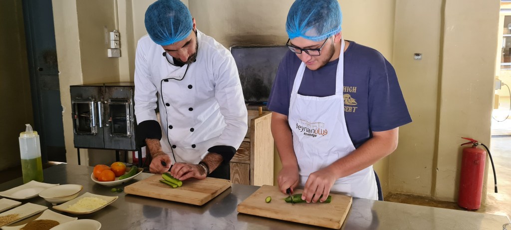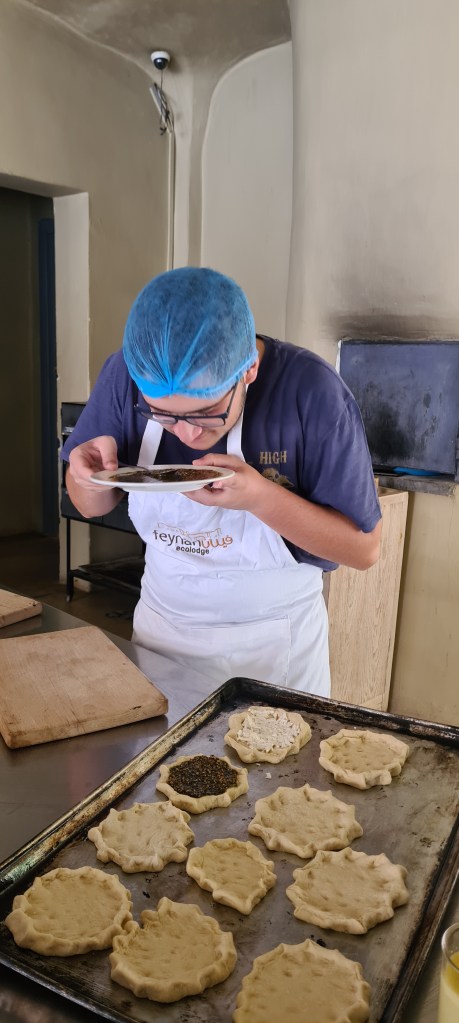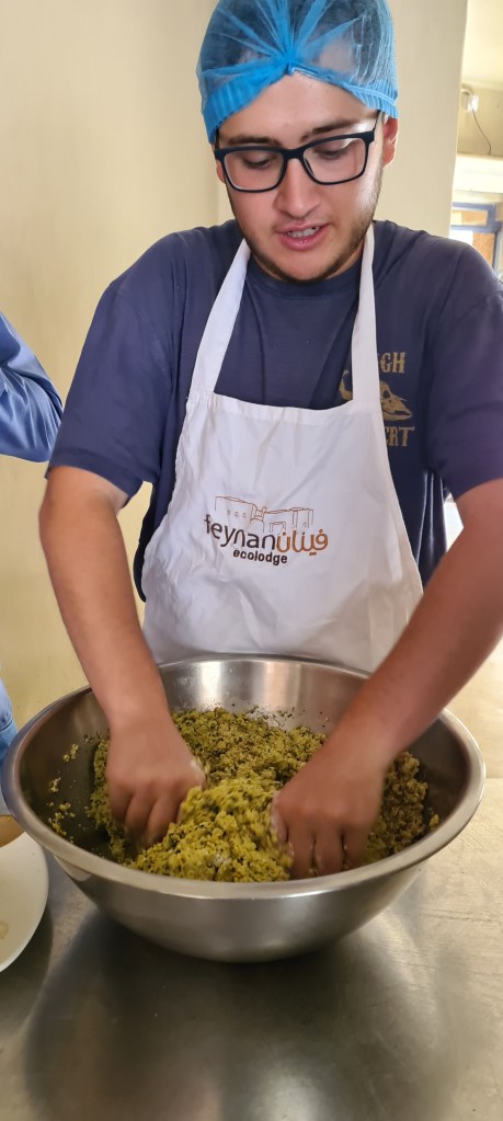 Equipado al más estilo Masterchef comienza la «master class» de cocina beduína con el chef, cocinero principal del alojamiento. Sesión de fotos al aprendiz de cocinero y todos muchas risas.