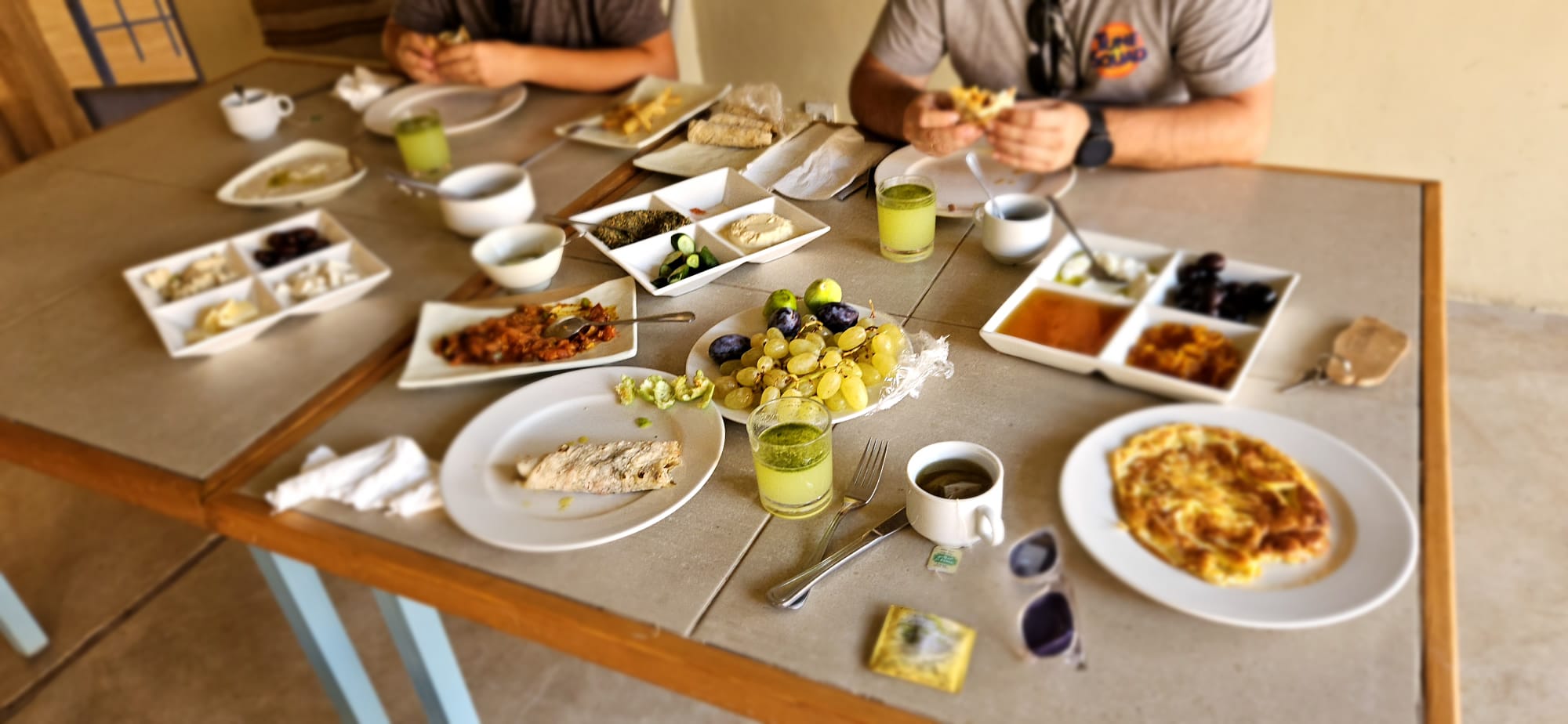 Un nuevo día nos despierta en Feynan Ecolodge con un desayuno jordano estupendo en el salón porque hay muchas muchas abejas enenormes y muy peligrosas (así nos lo cuentan ellos) en el jardín.