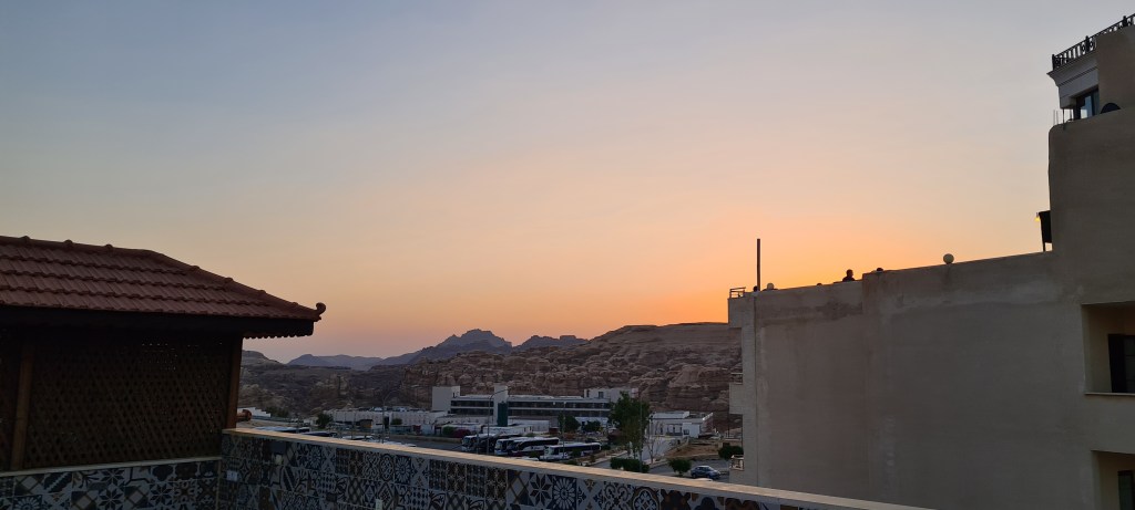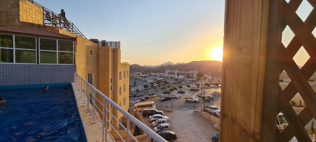 En la otra parta de la azotea hay un restaurante, en el que cenamos una de las noches que estuvimos en Petra, con vistas a la ciudad moderna de Petra.