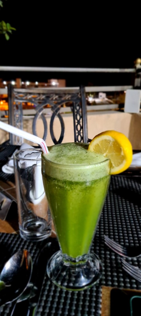 Cuando el sol desaparece se encienden las velas que lo iluminan todo. Estamos solos en el hotel, somos los únicos clientes. Nos preparar la cena en la terraza – jardín exterior. Una cena exquisíta bajo la luz de las velas.