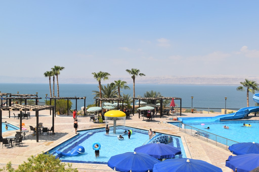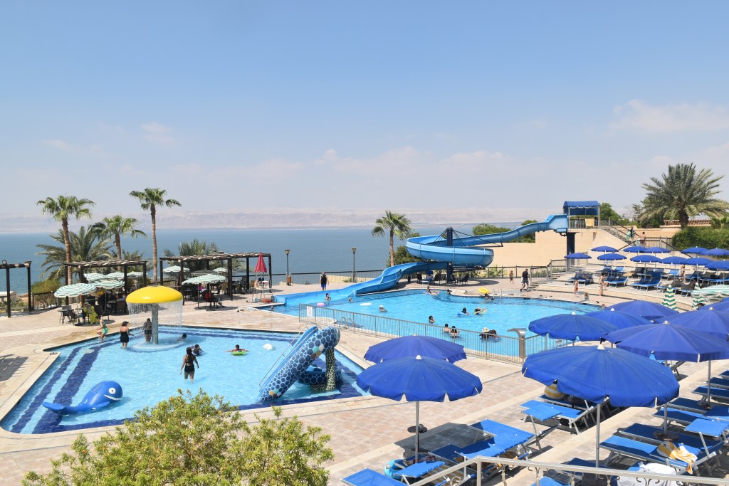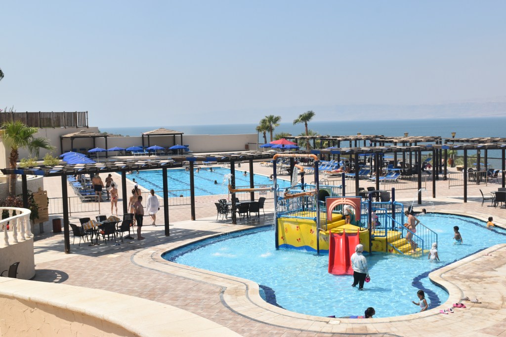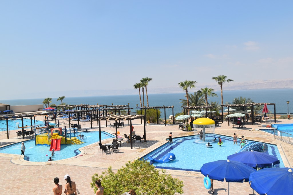 Es un complejo familiar con piscinas en el exterior, una de ellas con un gran tobogán. Una gran terraza mirador con vistas al mar. El hotel también tiene un montón de servicios como los balnearios, para hacer diferentes tratamientos. Varios restaurantes, zona para jugar al billar. Es un complejo enorme con acceso a la playa privada. Todos los hoteles tienen playa privada, la verdad es que hay pocos accesos públicos al Mar Muerto.