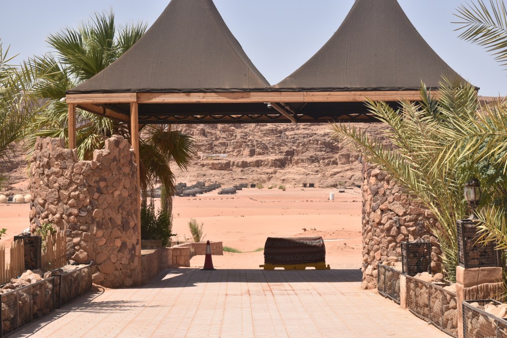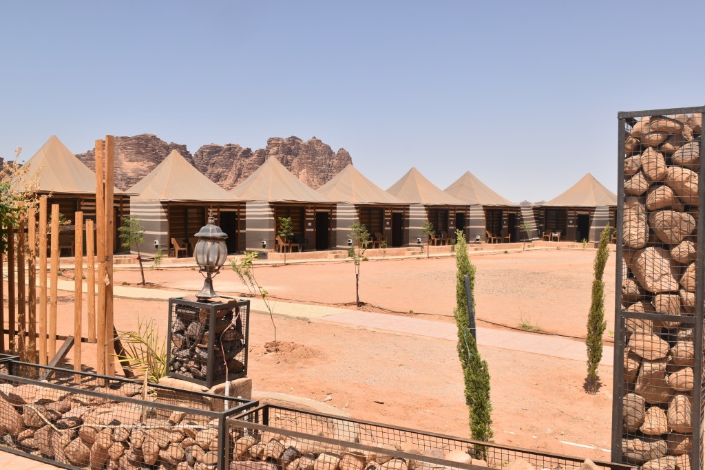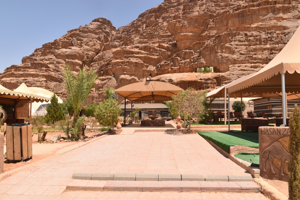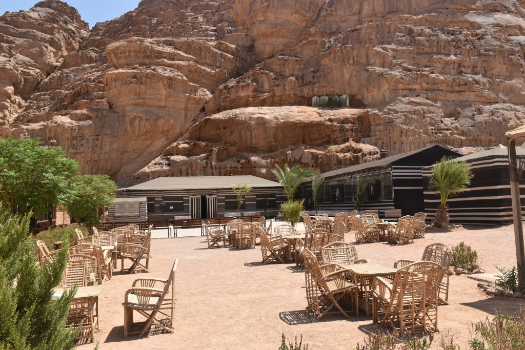 Las zonas comunes tienen la misma decoración que las tiendas, con varios comedores interiores (uno de ellos es una esfera gigante) y mesas en el exterior para disfrutar de las comidas típicas de Jordania. Por las noches se preparan te y café en un fuego y hay bailes de todo tipo (también sonó «La Macarena»).