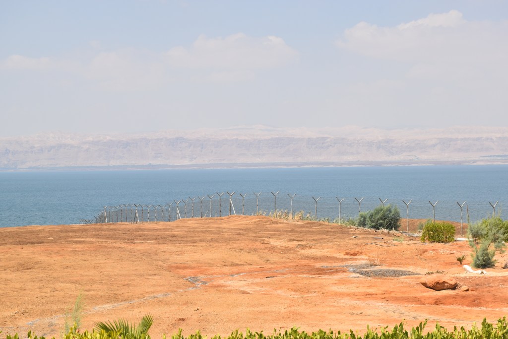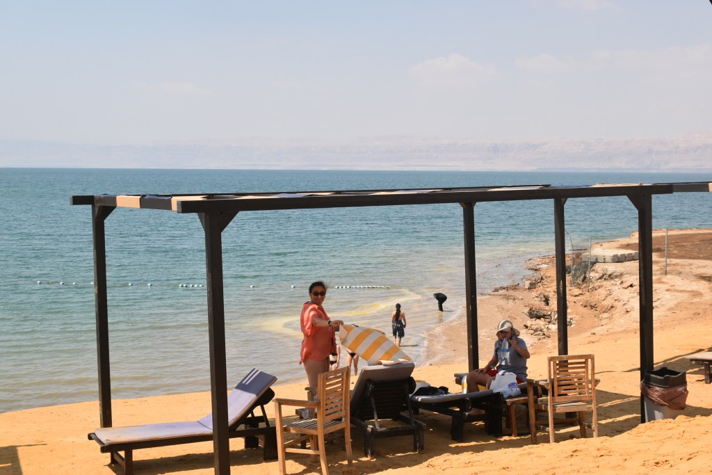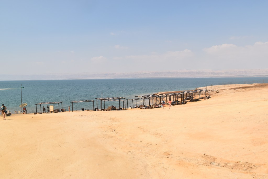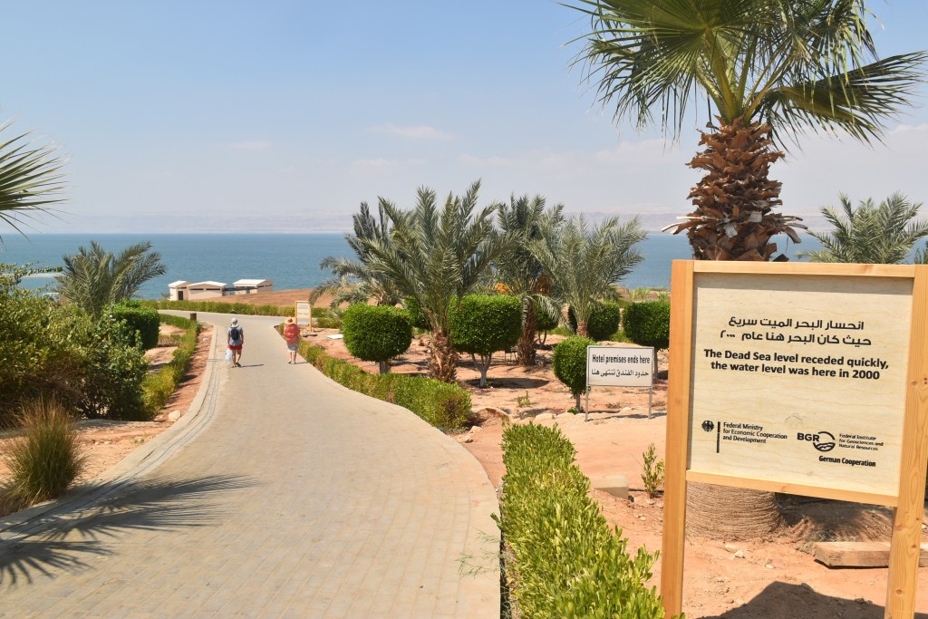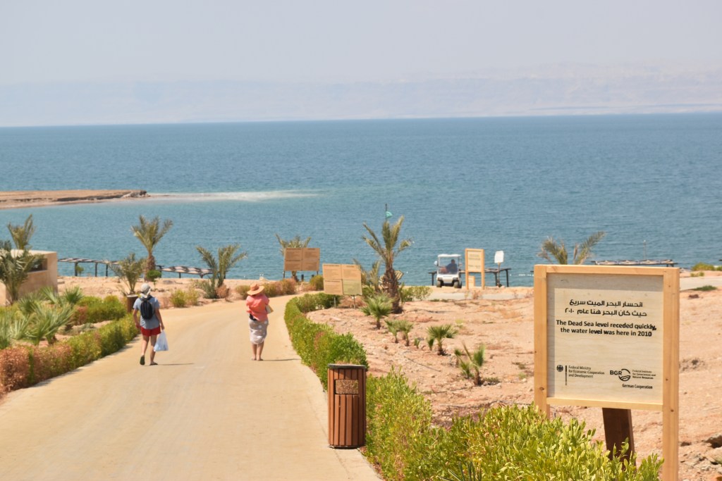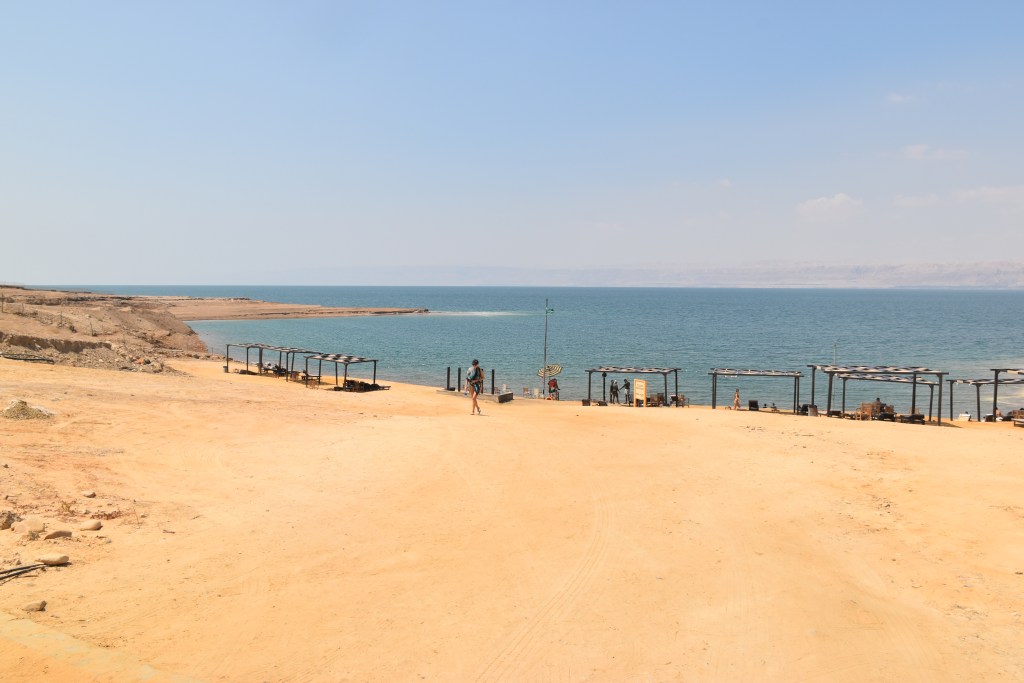 Bajar al Mar Muerto implica recorrer todo el complejo para salir por unas puertas que recorren un paseo de antiguas sombrillas donde ya no hay agua. El Mar Muerto está desapareciendo. Podemos ser testigos de todo lo que se ha perdido.