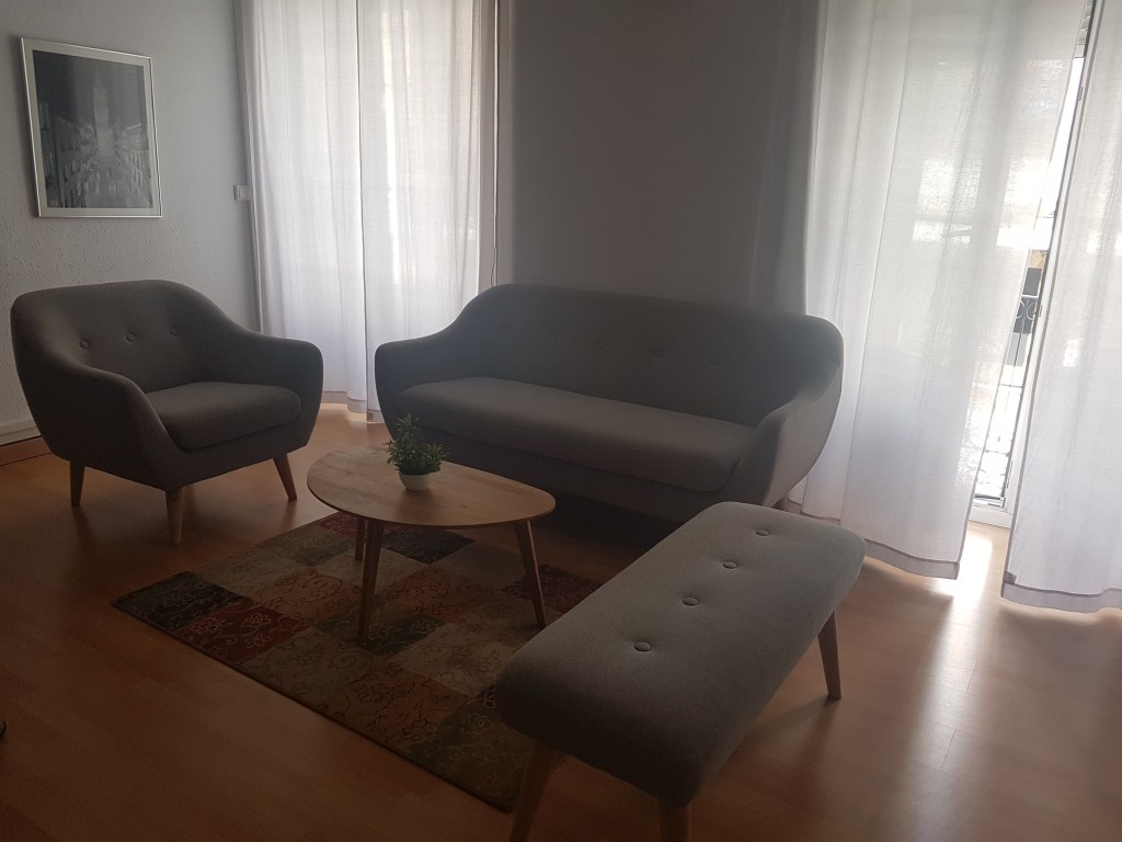 Nuestro apartamento tenía dos habitaciones, un baño, un salón con cocina americana y un pequeño balcón que daba a los jardines del complejo.