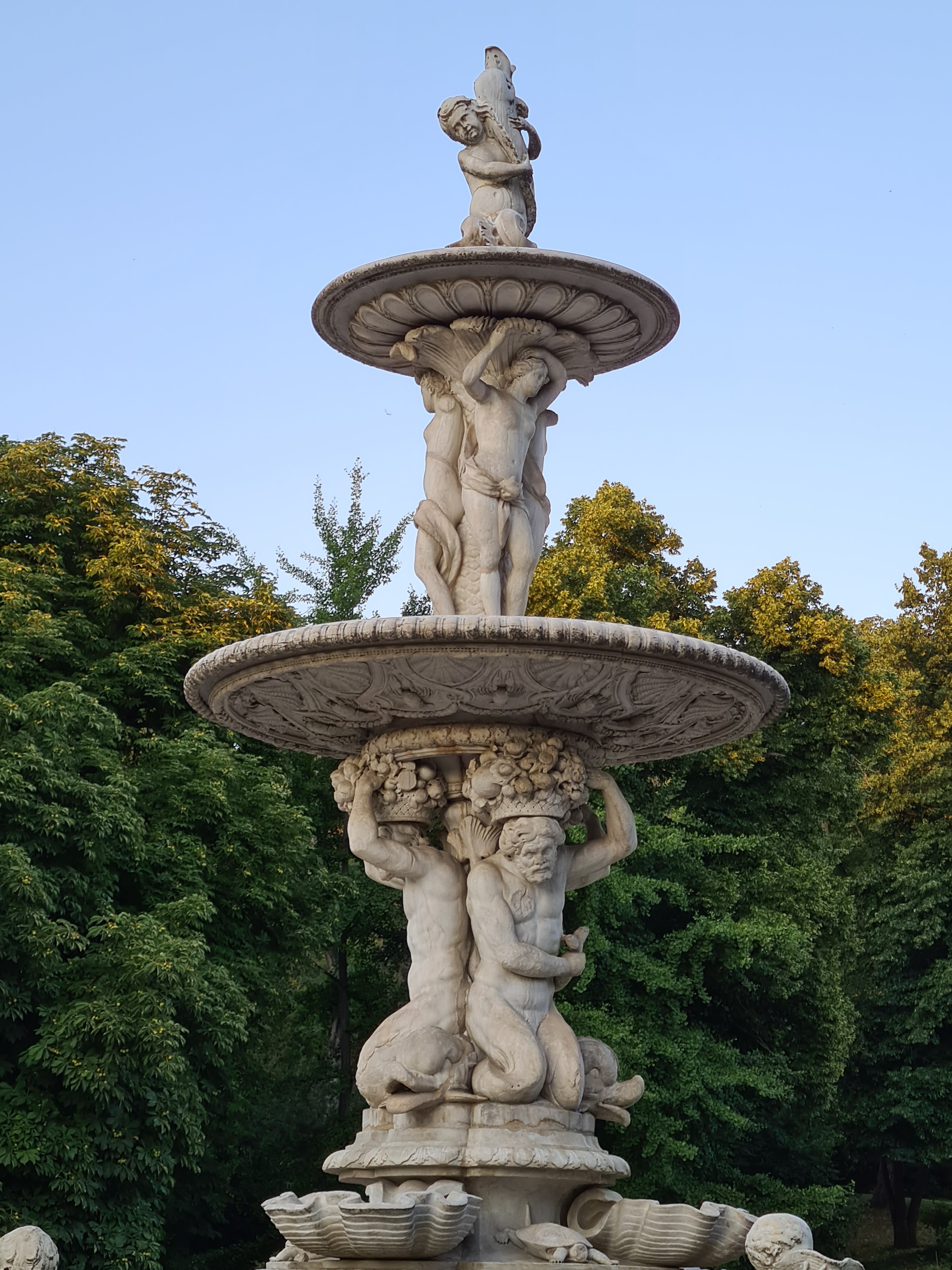 La fuente de las conchas, viene del Palacio del Infante Don Luis de Boadilla del Monte. La fuente de los tritones del Jardín de la Isleta de Aranjuez.