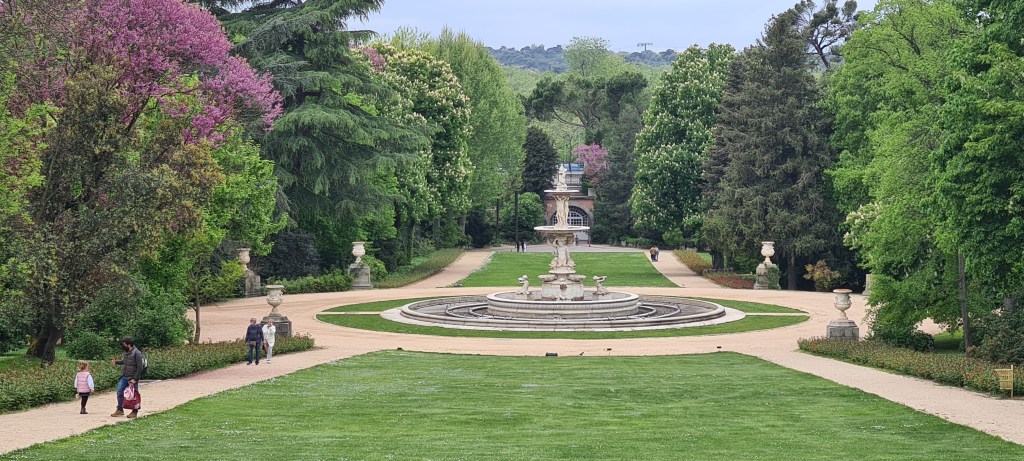 Salimos de nuevo al camino central, sin poder subir a la Fuente de los Tritones (está cerrado ese paso).