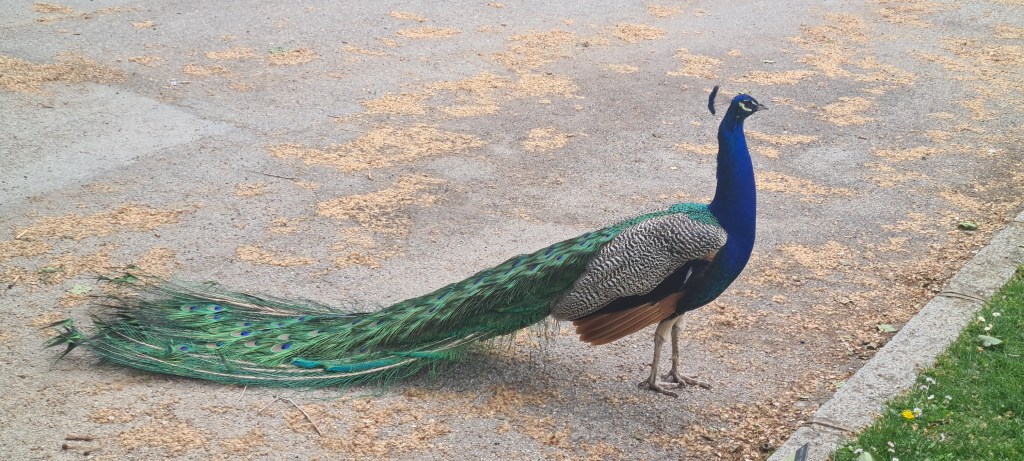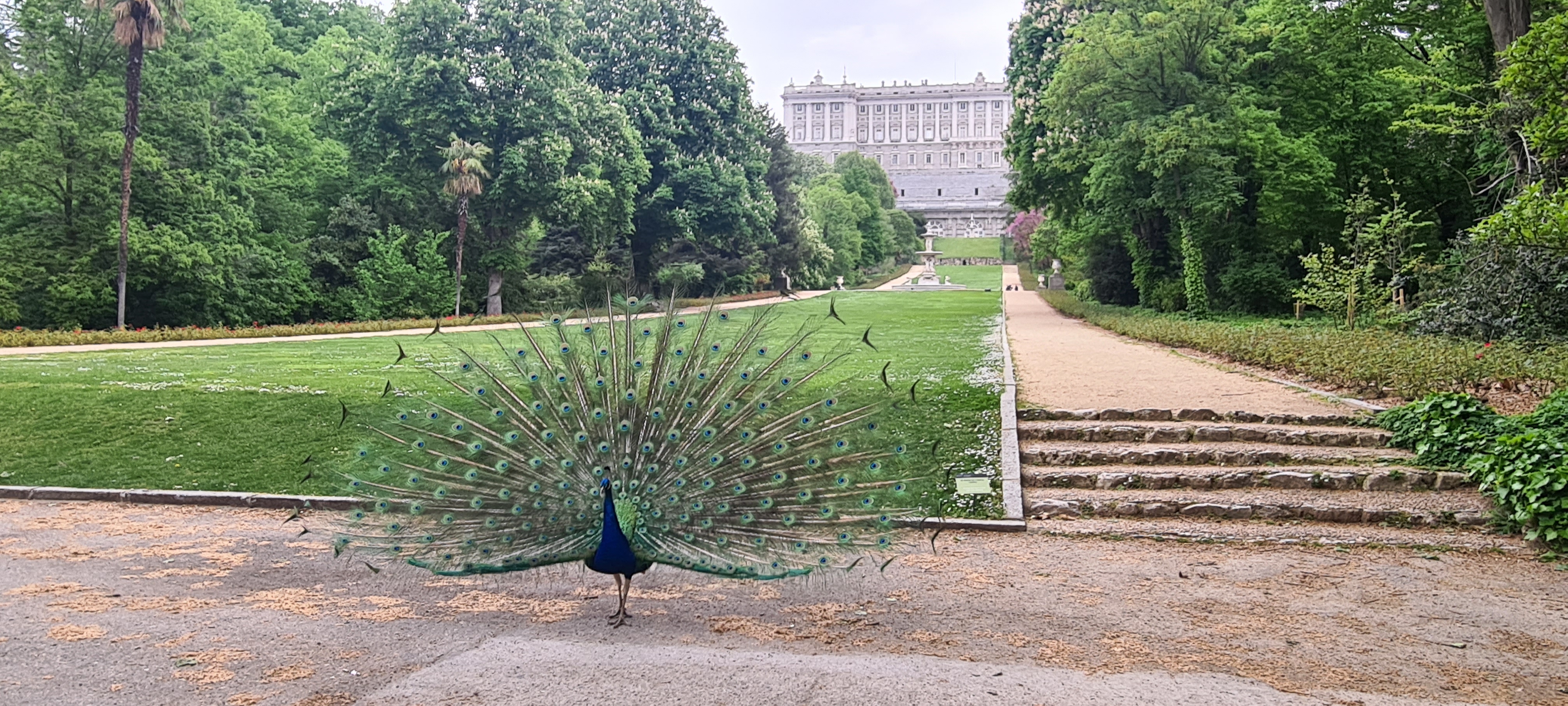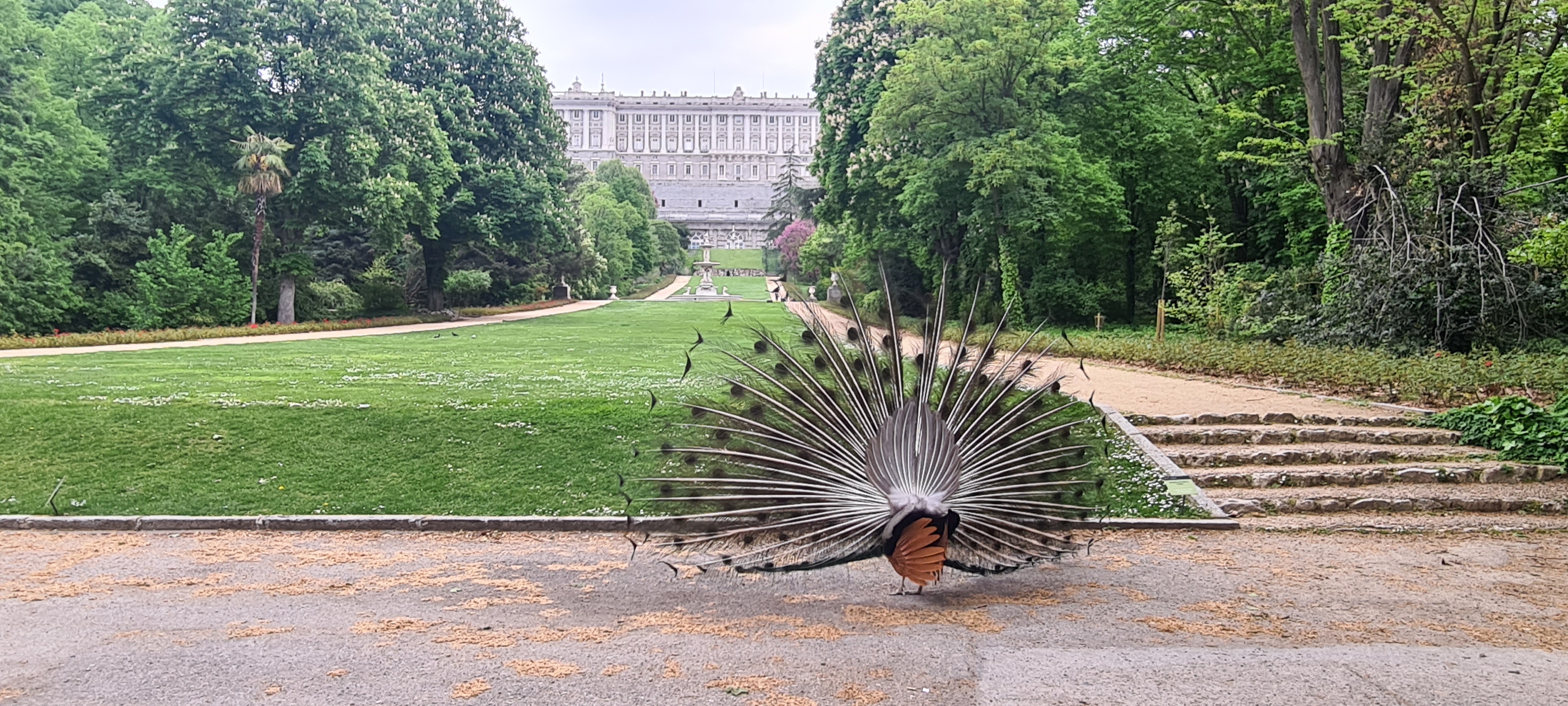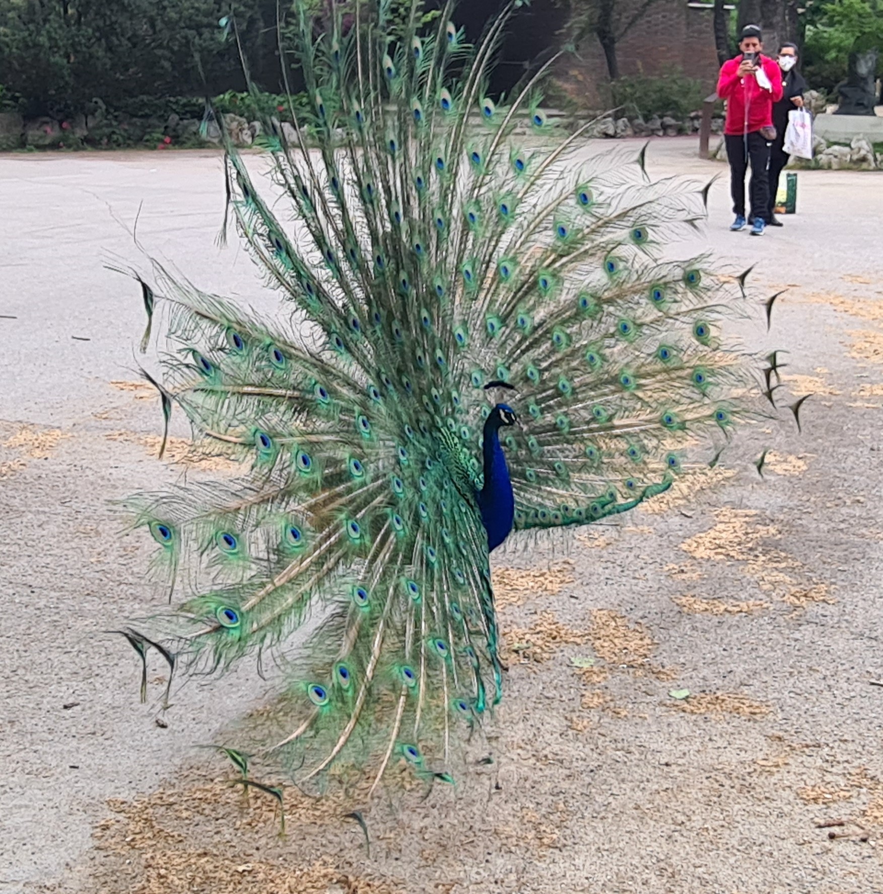 Para terminar nuestro paseo y ya casi saliendo a la parte de la escalinata, salen a despedirnos unos hermosos pavos reales. Tuvimos la suerte de que el macho estaba en pleno cortejo y las instantáneas que nos dejó, fueron preciosas.