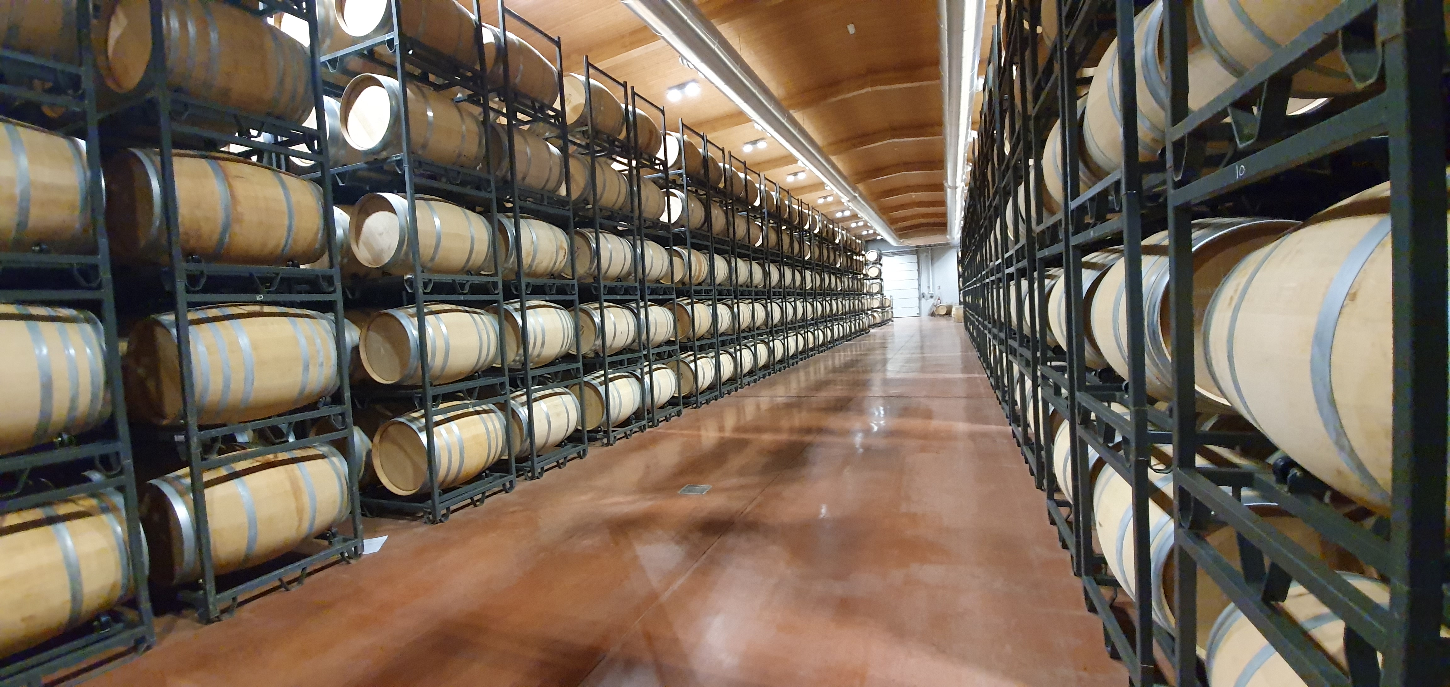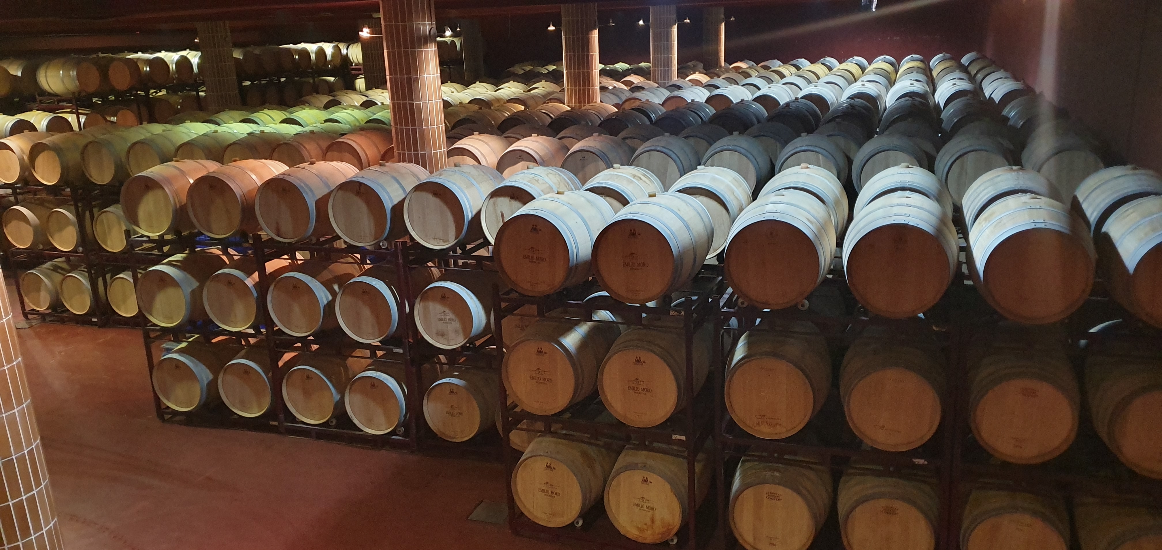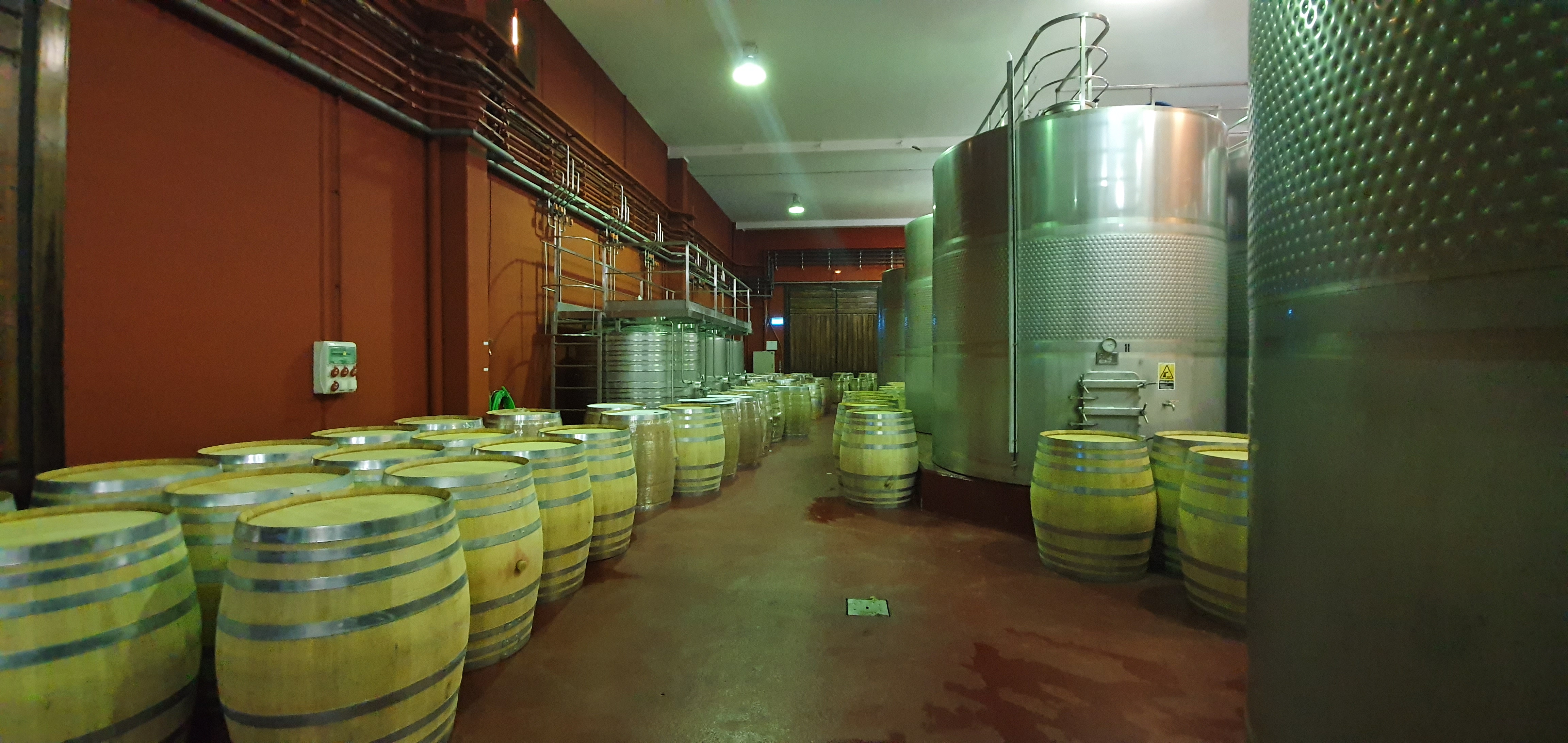 Empezamos recorriendo la nave de elaboración del vino, la sala de las barricas y la sala de embotellado.