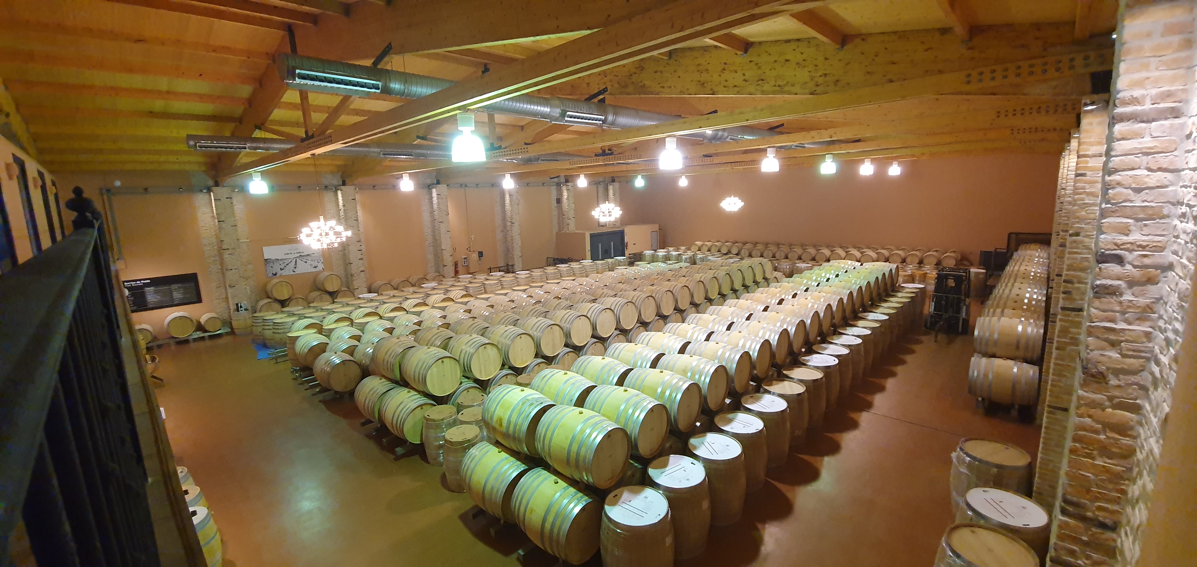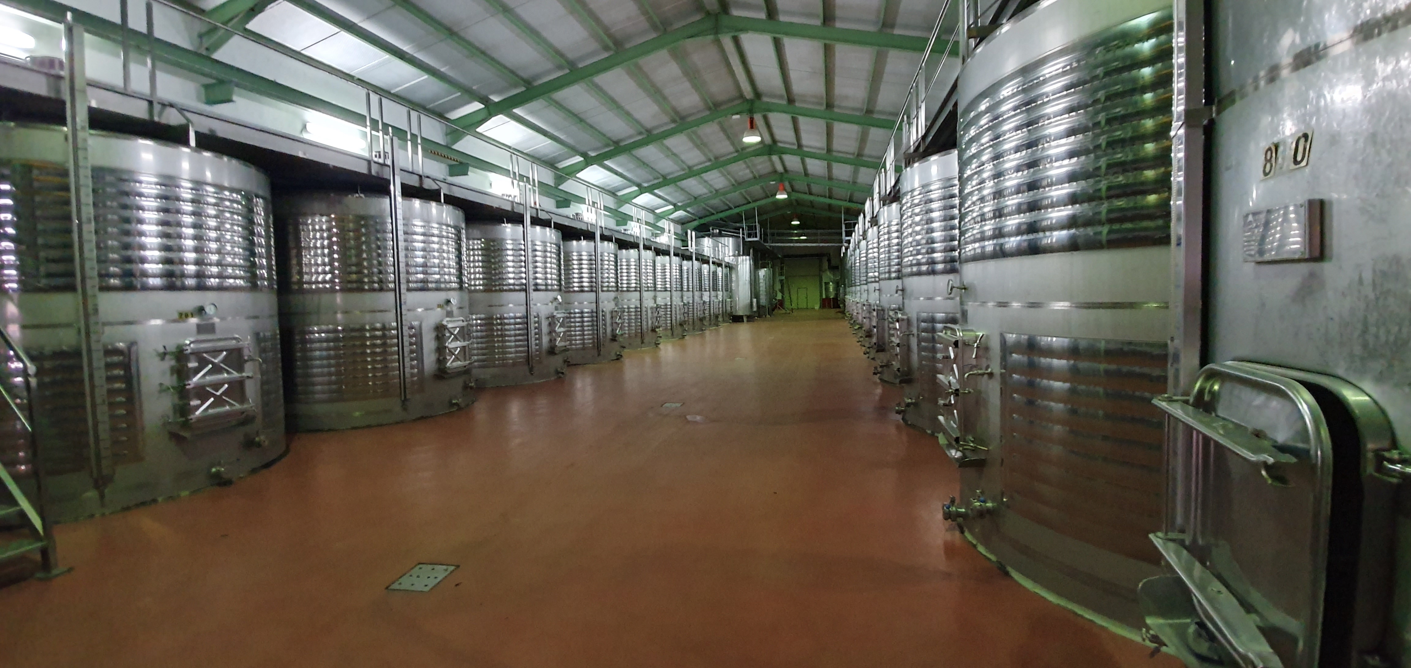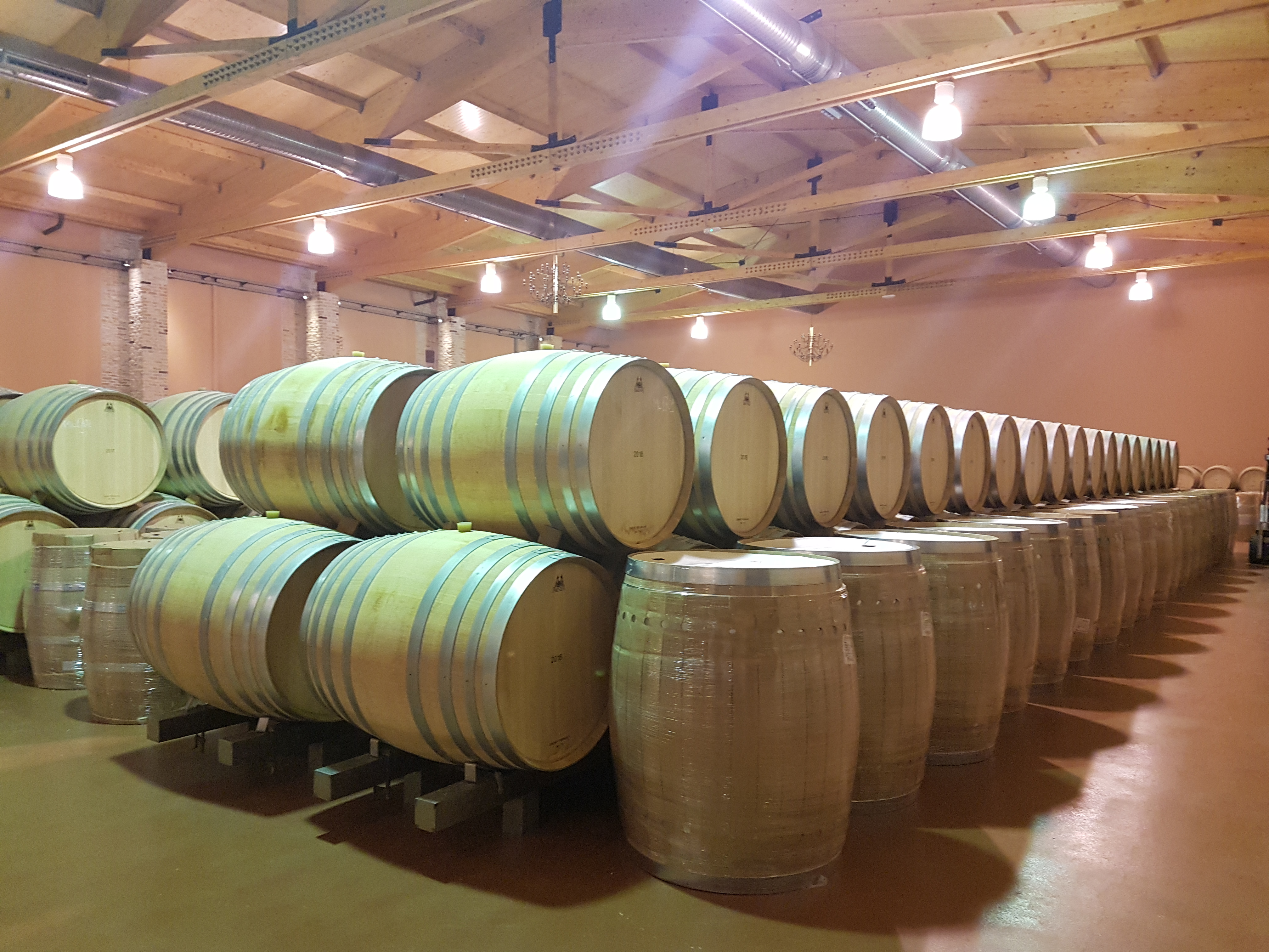 Empezamos recorriendo la nave de elaboración del vino, la sala de las barricas y la sala de embotellado.